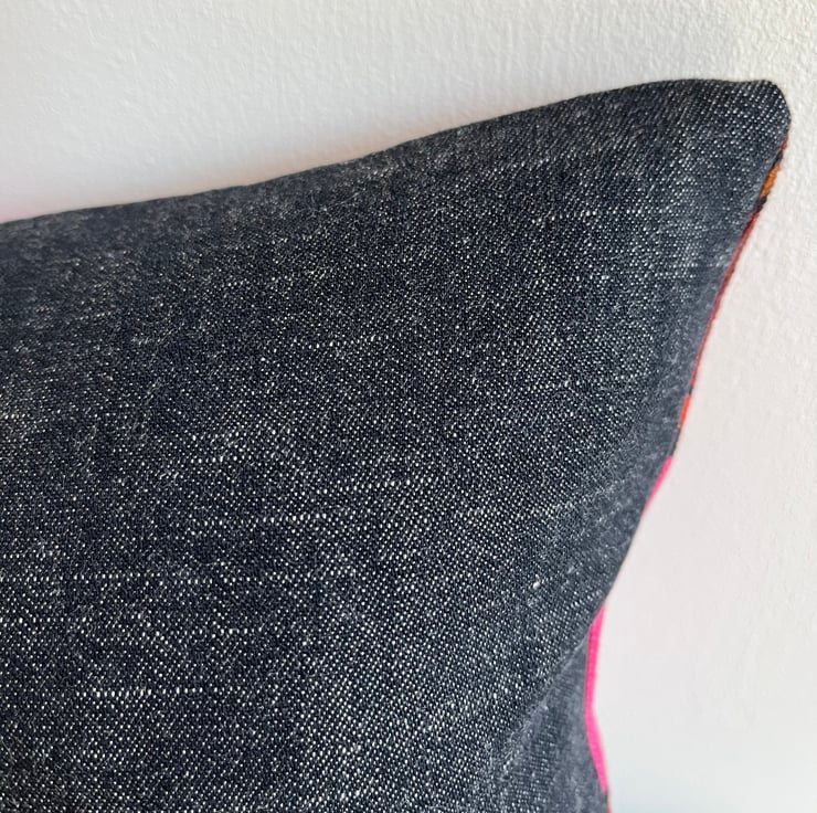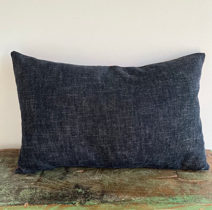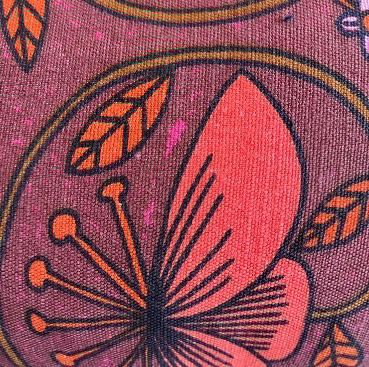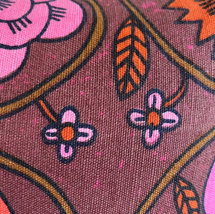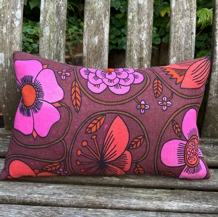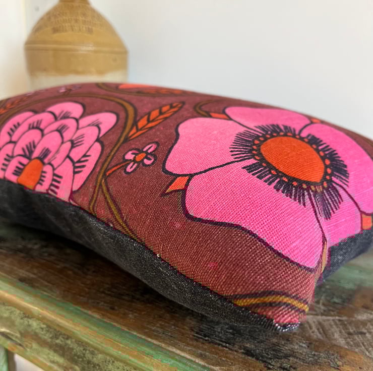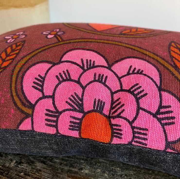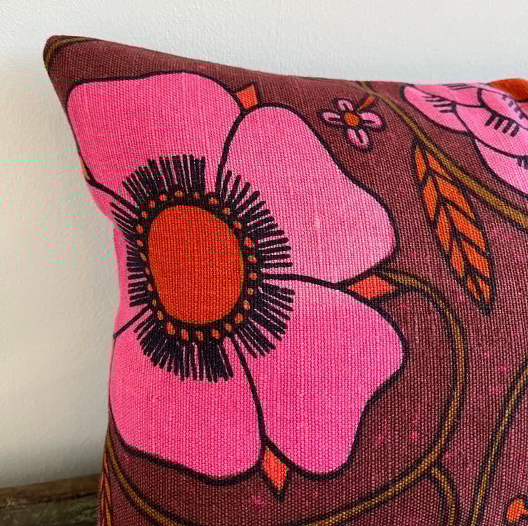 Bright feature cushion cover in reclaimed retro linen fabric. The bright pink flowers shine out from a deep red background. The cover is backed in soft denim-look fabric from a sample swatch leftover from the fashion industry.
