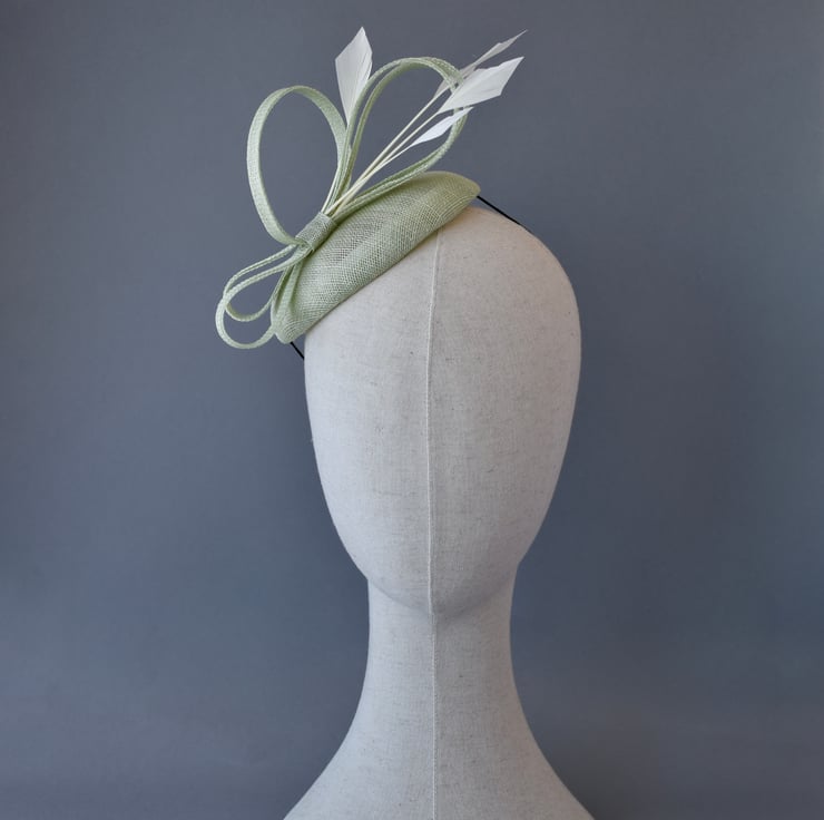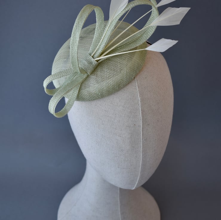 A pretty handmade percher style hat, handcrafted in my millinery studio in Kent from sinamay, and trimmed with diamond shaped ivory goose feathers.