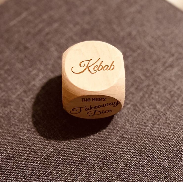 A personalised XL wooden takeaway dice and personalised with your favourite food