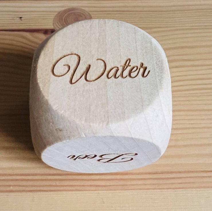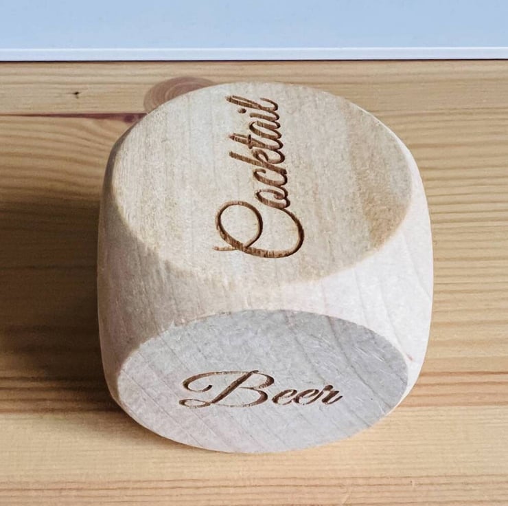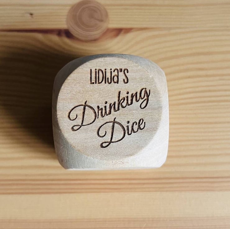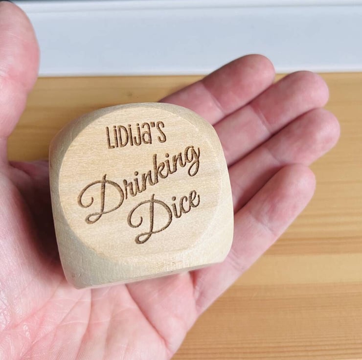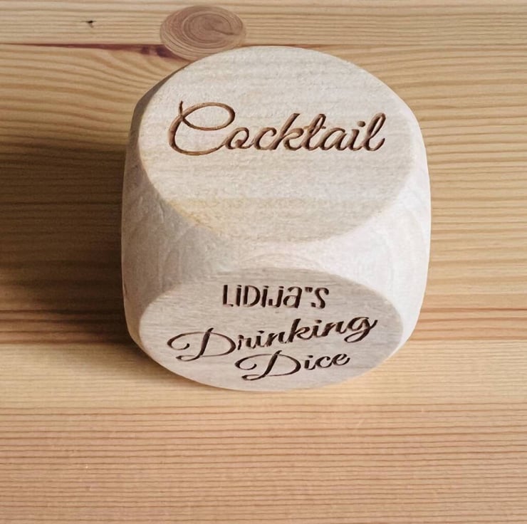 A personalised XL wooden drinking dice and personalised with your favourite drinks