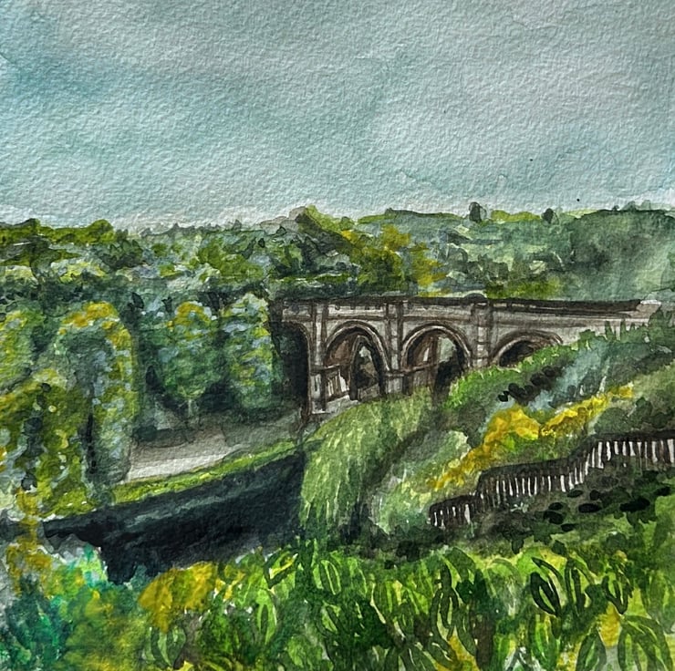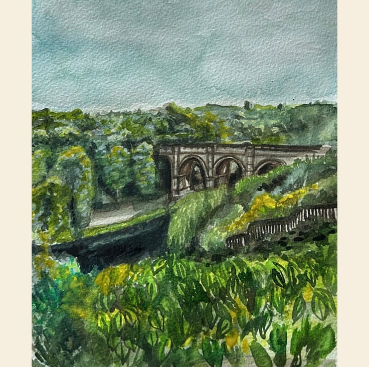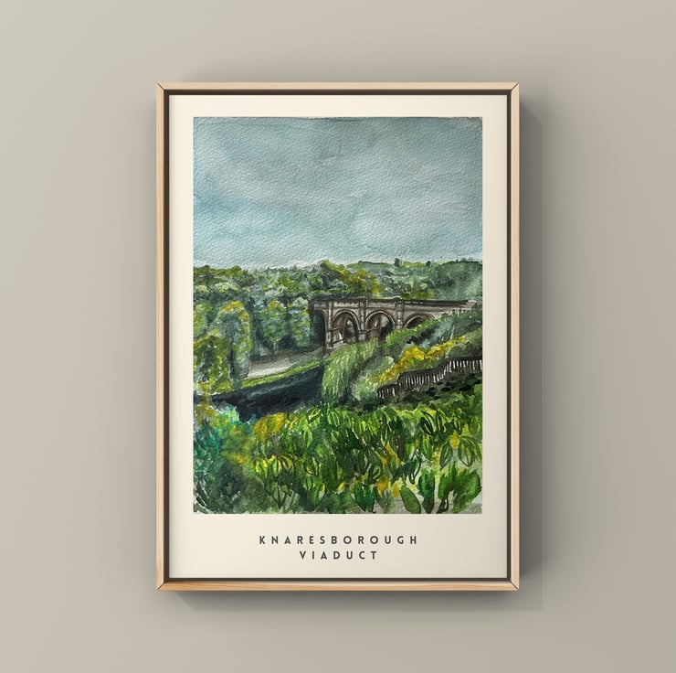A luscious green print of landscape art in watercolours. This painting is based on a photograph I took of the infamous Knaresborough Viaduct in North Yorkshire down near the River Nidd.