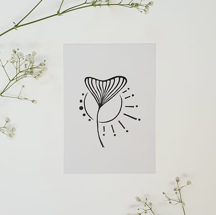 This is an A6 digital reproduction of an original lino print of mine. It is printed with black ink on 300gsm uncoated recycled paper in an off-white colour. The paper is made with 100% recycled pulp and up close you can see long recycled fibres peppered through it which gives it a lovely natural touch.