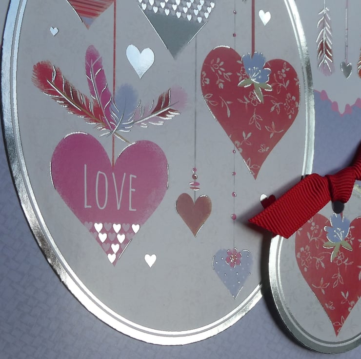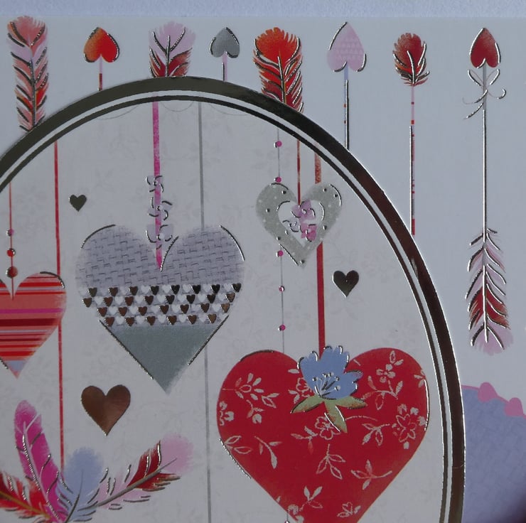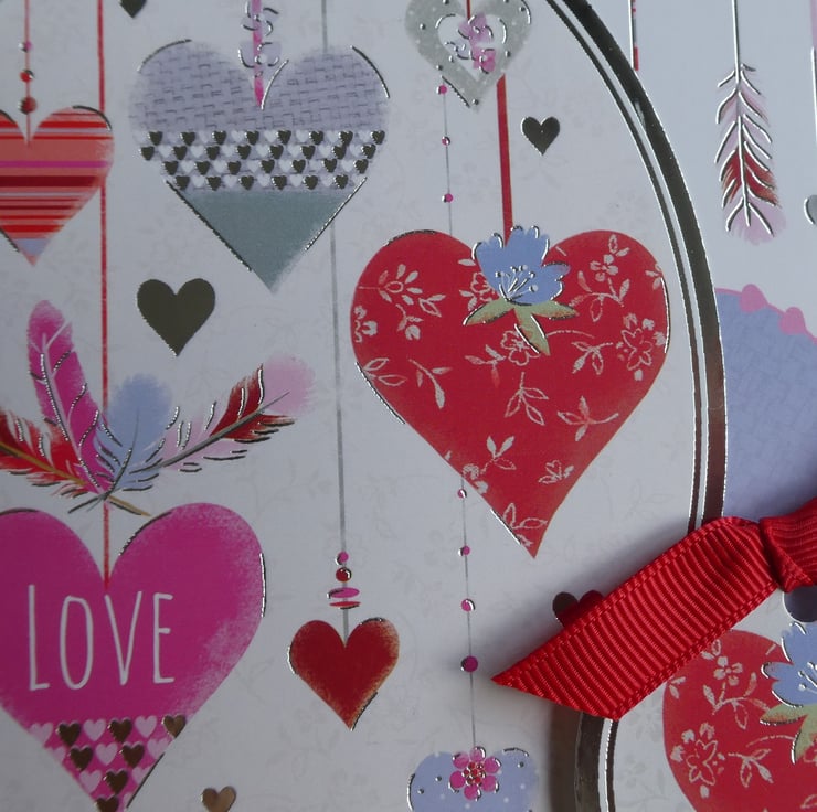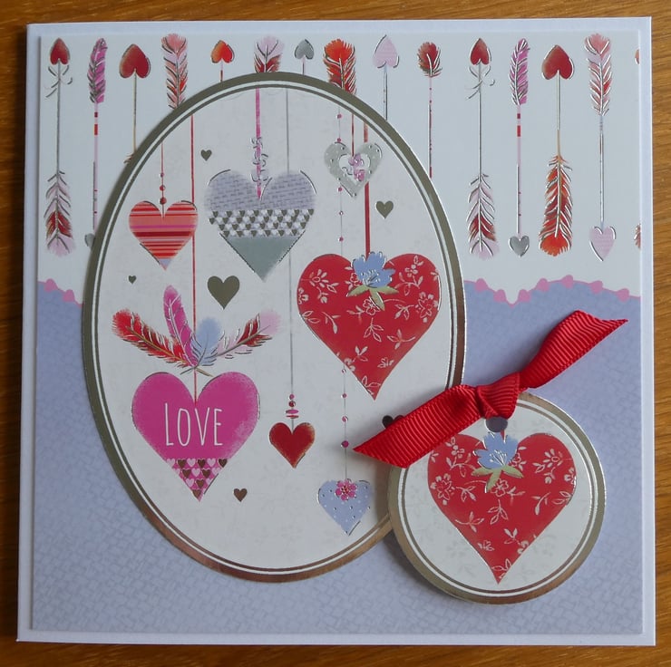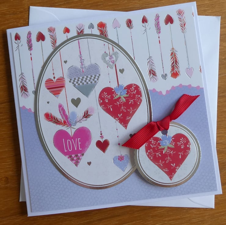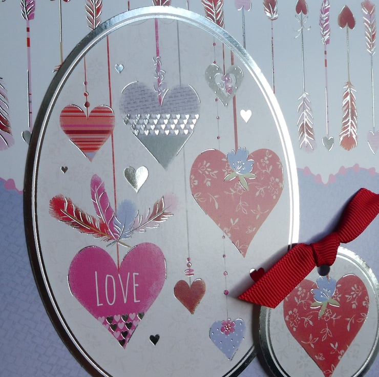 An oval printed image of hanging hearts in different sizes and patterns in shades of red, pink, grey and pastel blue has been mounted onto a background of pale blue card with a border along the top of feathered arrows with hearts for tips. The hearts and arrows all have silver foiled accents to match the frame around the main image.