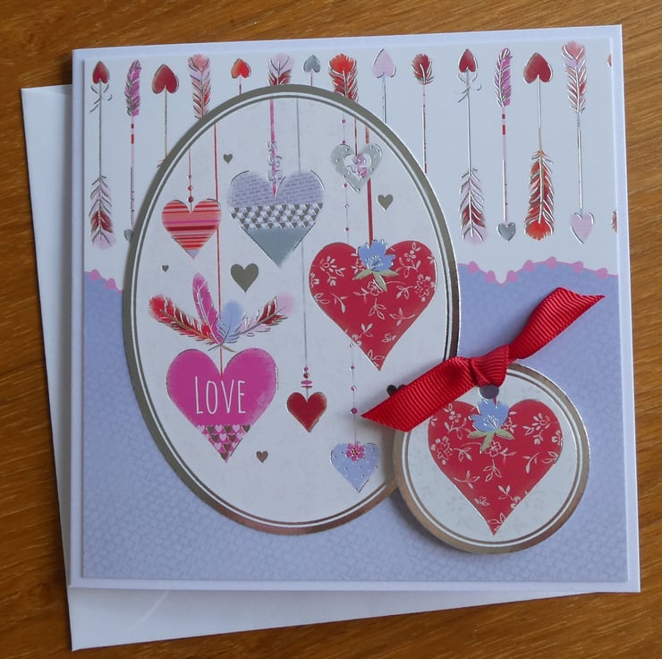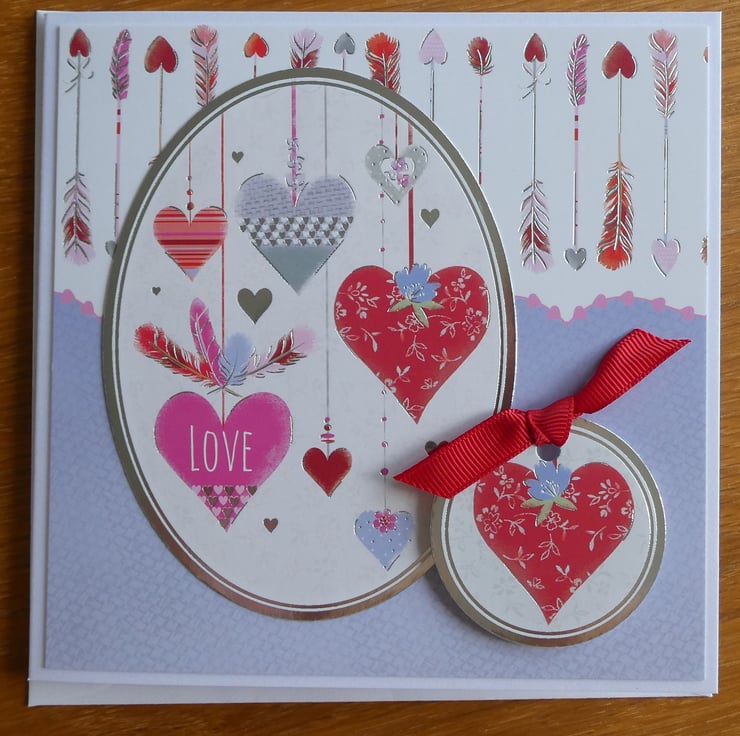 This card with images of hearts and feathers and the word Love would be perfect as an engagement, anniversary, wedding or valentines card.