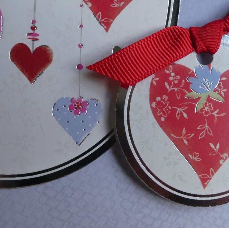 A circular tag, threaded with red ribbon with a red heart, pale blue flower and silver foiled border has been added to the bottom right corner, raised on foam pads to add dimension.