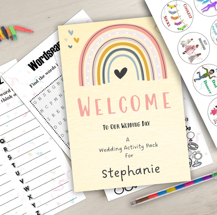 Our Personalised Children's Wedding Activity Pack, a fantastic addition to your wedding table, guaranteed to keep the young ones engaged all day long. Bid farewell to restless children and ensure a smooth, enjoyable day for everyone.
