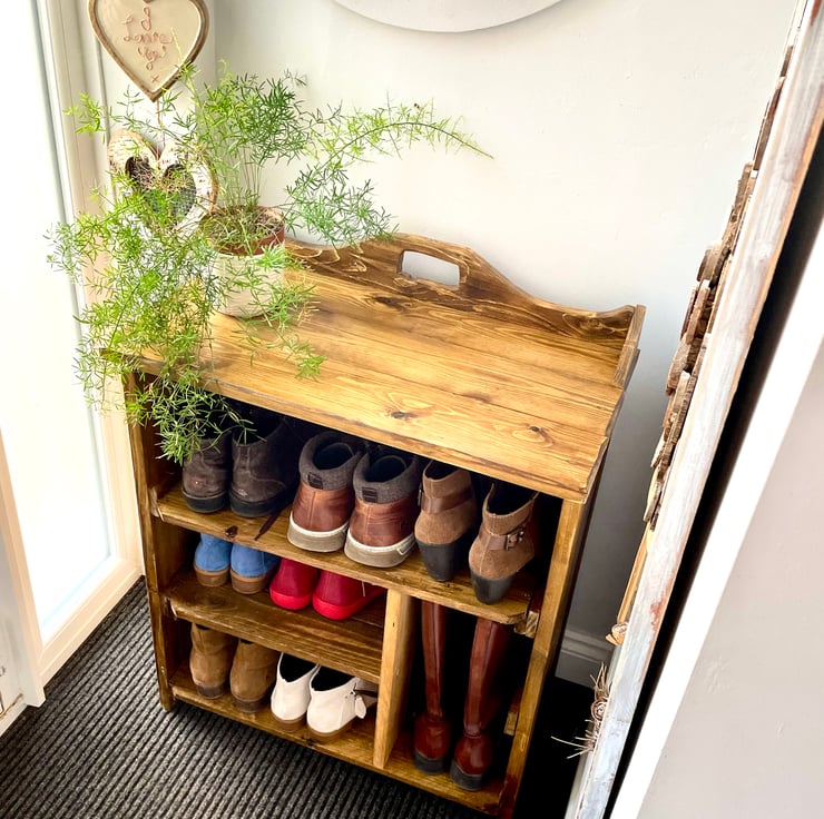 Keep those much needed shoes and assorted footwear in an orderly fashion. Your shoes need looking after as we are so passionate about them as a nation. This item is handmade of course! We make these from our choice stock of old timbers etc. We stain it with a specialist stain, a mellow mid rich oak the seal it with a tough finish. This finish can also be polished up beautifully.