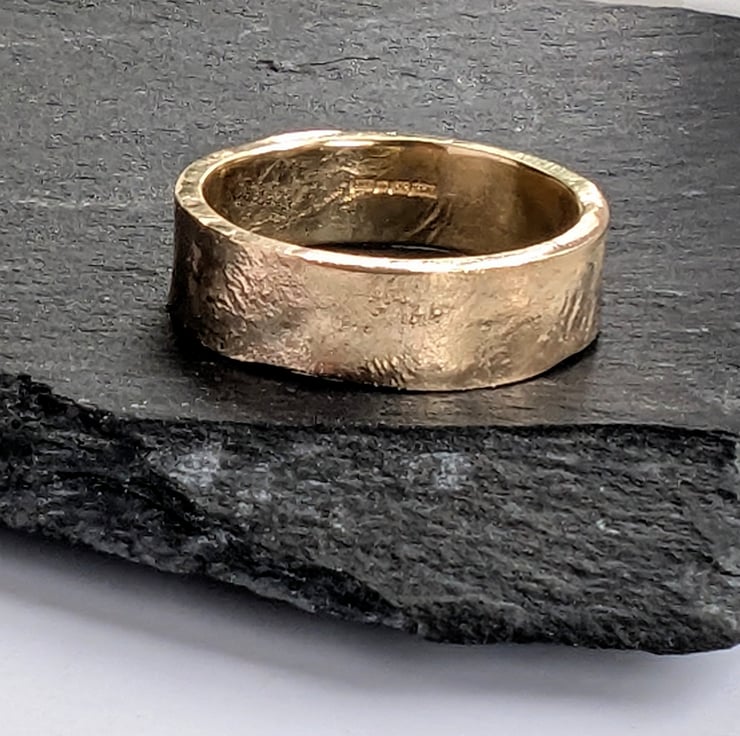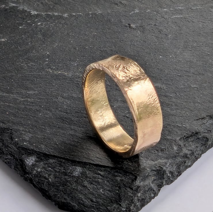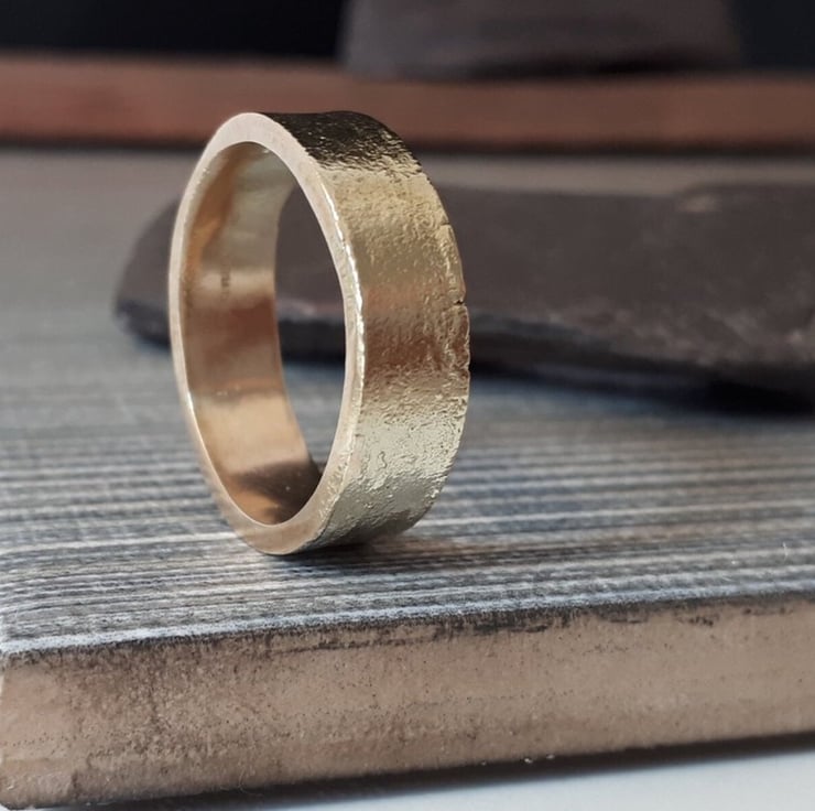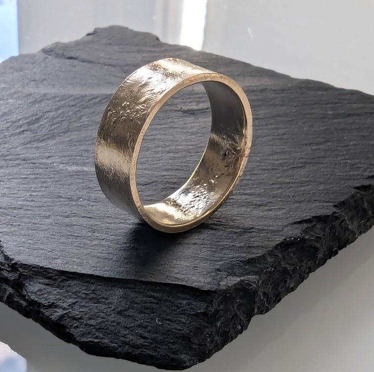 A reticulated textured handmade gold band is a unique and artisanal piece of jewellery. Crafted using intense heat from the jewellers torch, which involves controlled heating and cooling of the metal to create a distinct, organic texture on the surface. This results a one-of-a-kind ring with irregular patterns and handcrafted feel. The use of gold adds a luxurious touch to the piece, making it a beautiful and valuable accessory. It can be worn as a wedding band, engagement ring or simply as statement piece of jewellery. Made in different widths to suit indiviual tastes and preferences.