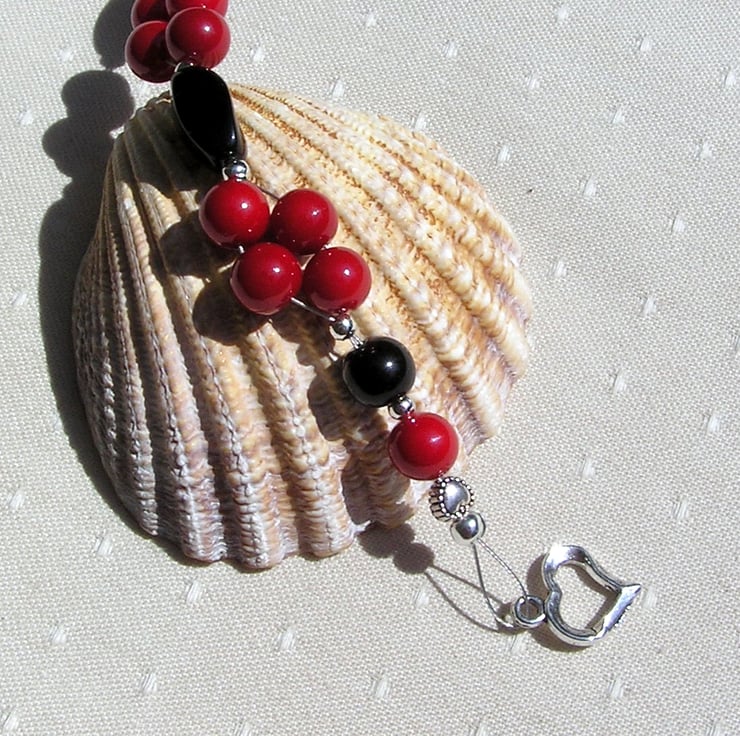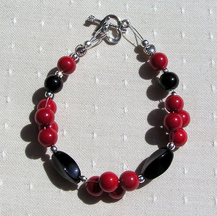 This Stunning Bracelet is made from Beautiful Natural Red Coral Beads, clustered together in Fours separated by Black Onyx Beads… Twisted Oblongs & Round beads - The Brightness of the Coral will look stunning with any outfit... either the casual look or wear it with something more Elegant for a Special Evening out