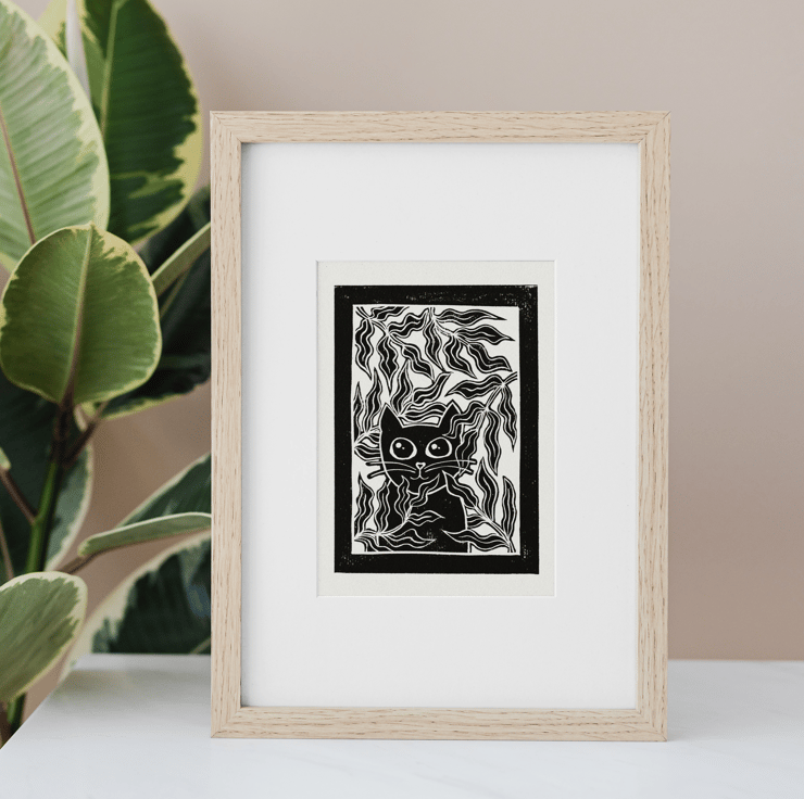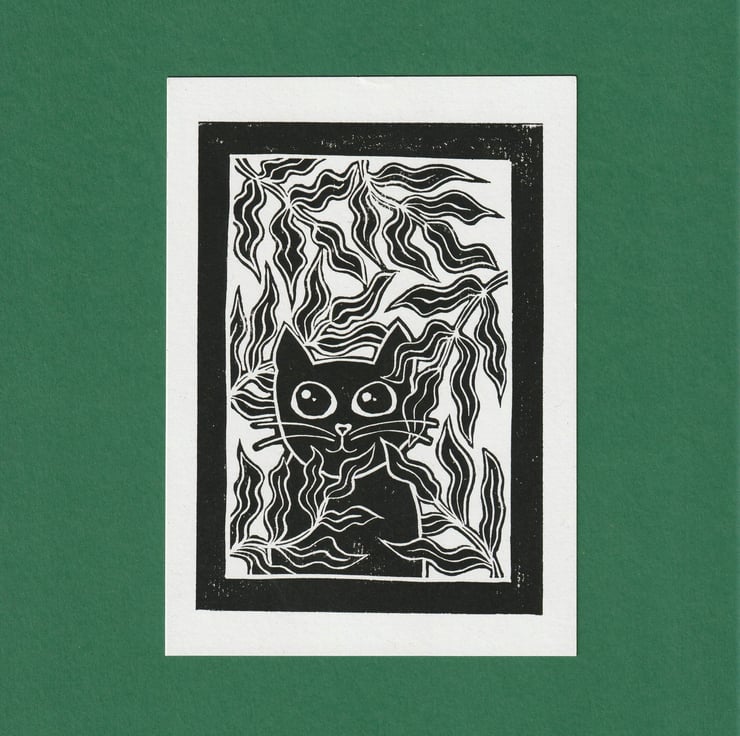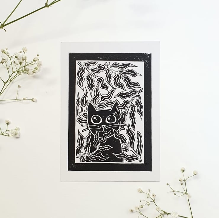 This is an A6 digital reproduction of an original lino print of mine. It is printed with black ink on 300gsm uncoated recycled paper in an off-white colour. The paper is made with 100% recycled pulp and up close you can see long recycled fibres peppered through it which gives it a lovely natural touch.