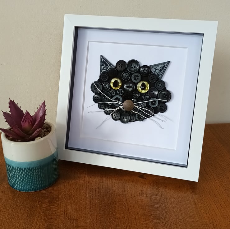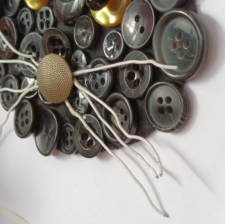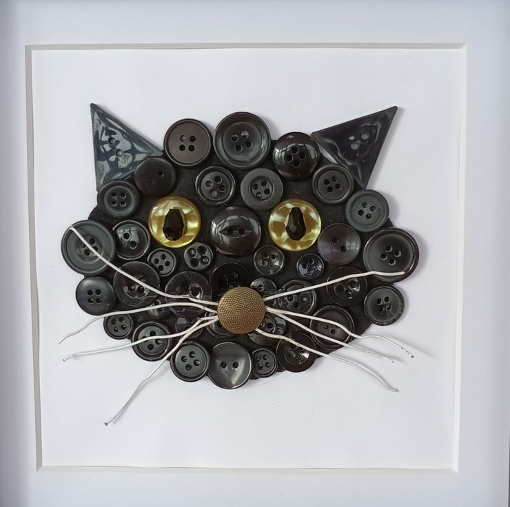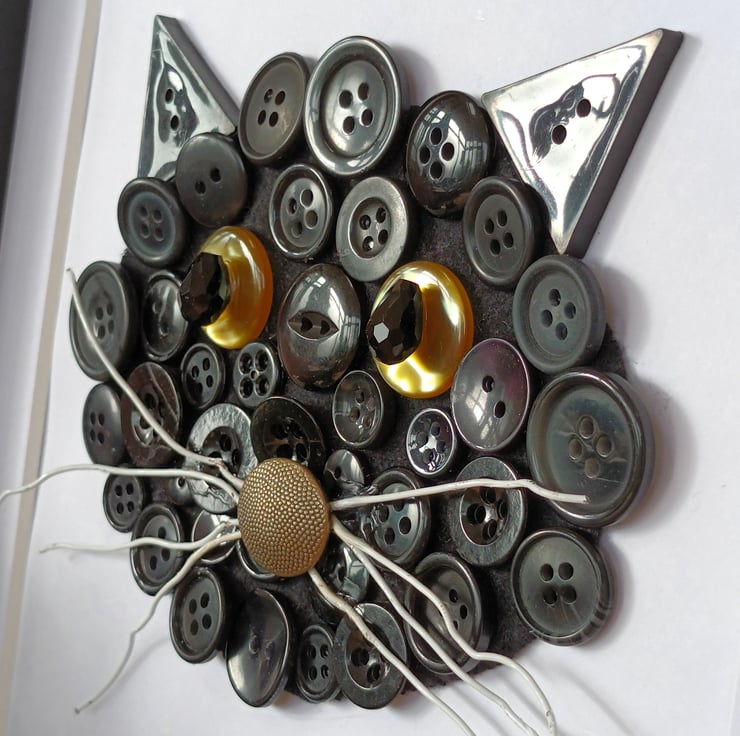 This piece uses an awful lot of spare buttons that have never been put to their original use. The whiskers are made with the wire from an old calendar and the pupils are a pair of old earrings.