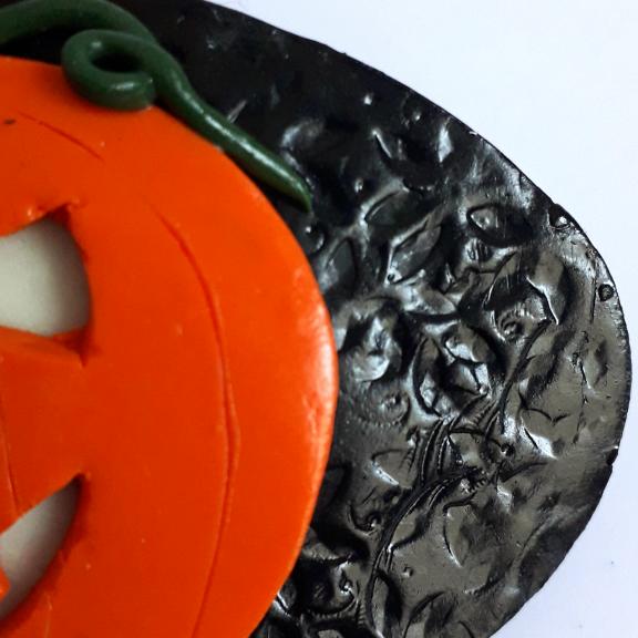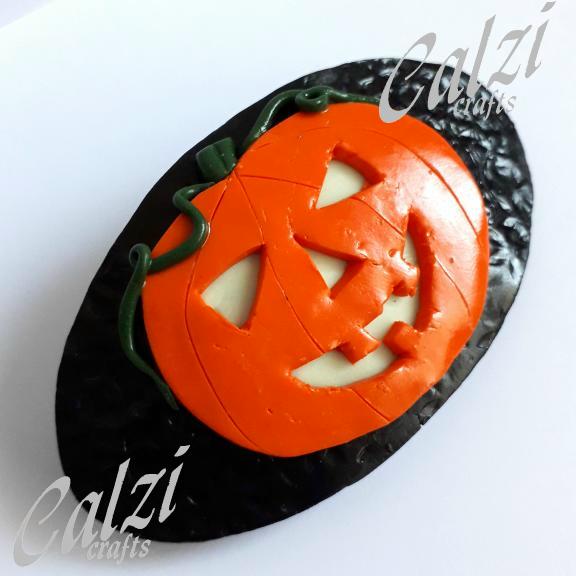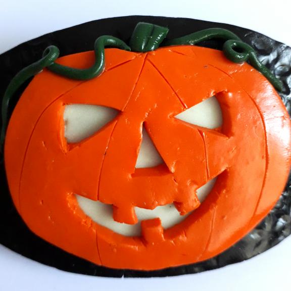A polymer clay hair barrette featuring a halloween pumpkin with glow in the dark features.
