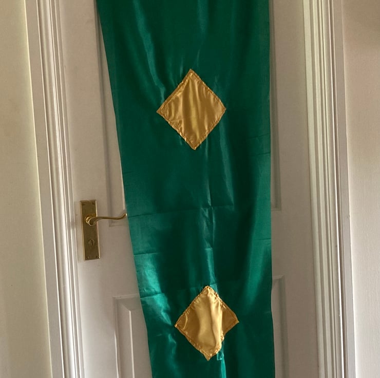 Beautiful funky heraldic style pennant. Made from polyester. Washable. Light iron if necessary. Fly from a telescopic or other pole at least 5m long. Allow appropriate flying distance if used in a garden, as the pennant is just over 2m long. Great for campers to mark their spot in the field or at the beach.