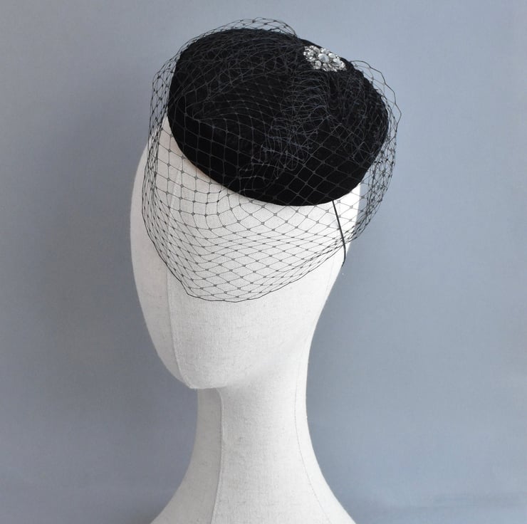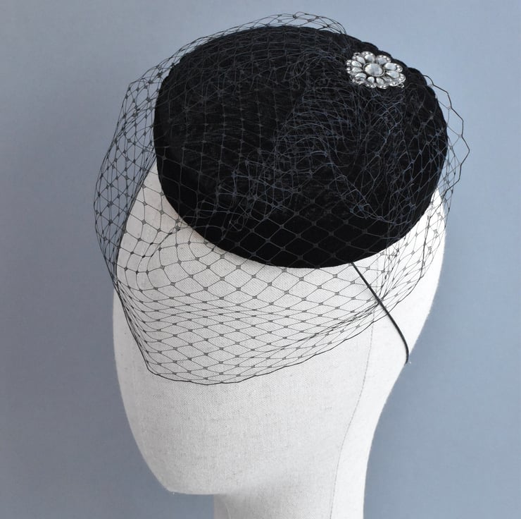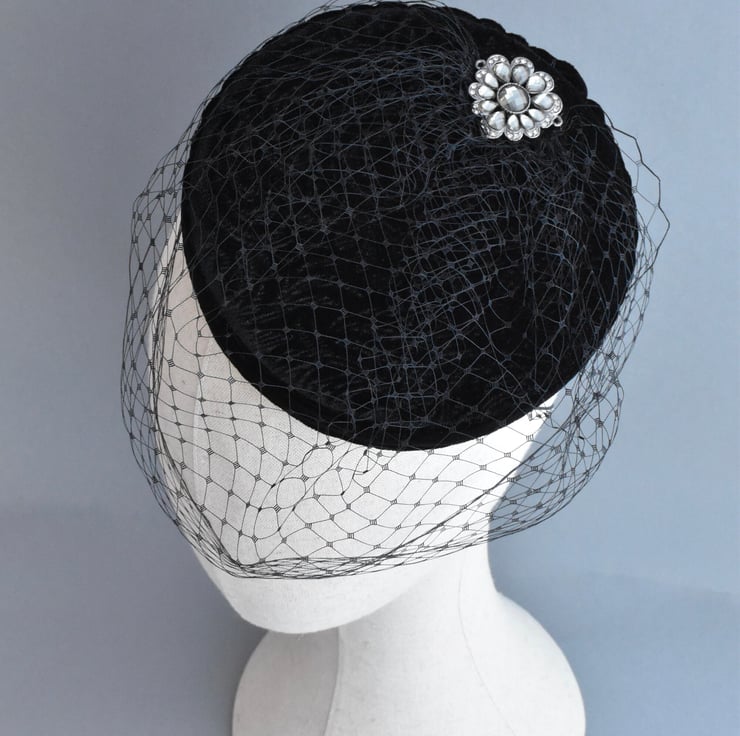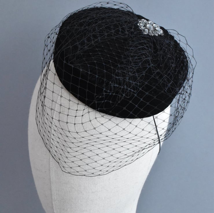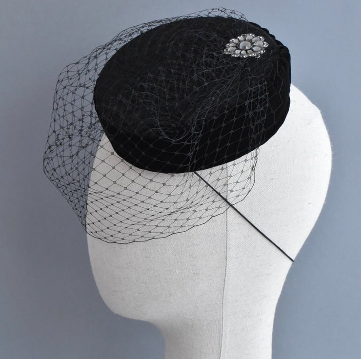 A one-of-a-kind vintage inspired pillbox hat. It's covered in a beautiful black velvet with a subtle pattern. The hat is trimmed with a black birdcage veil, and finished with a detail from a piece of repurposed jewellery to make this a unique hat.