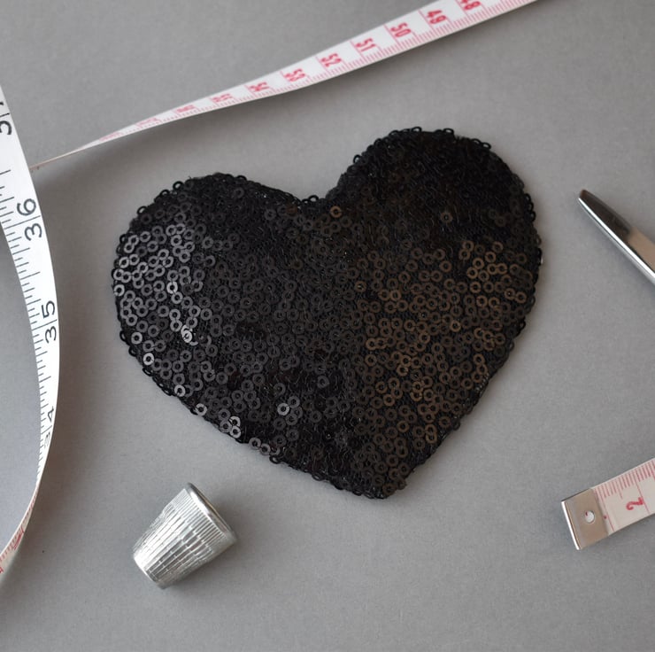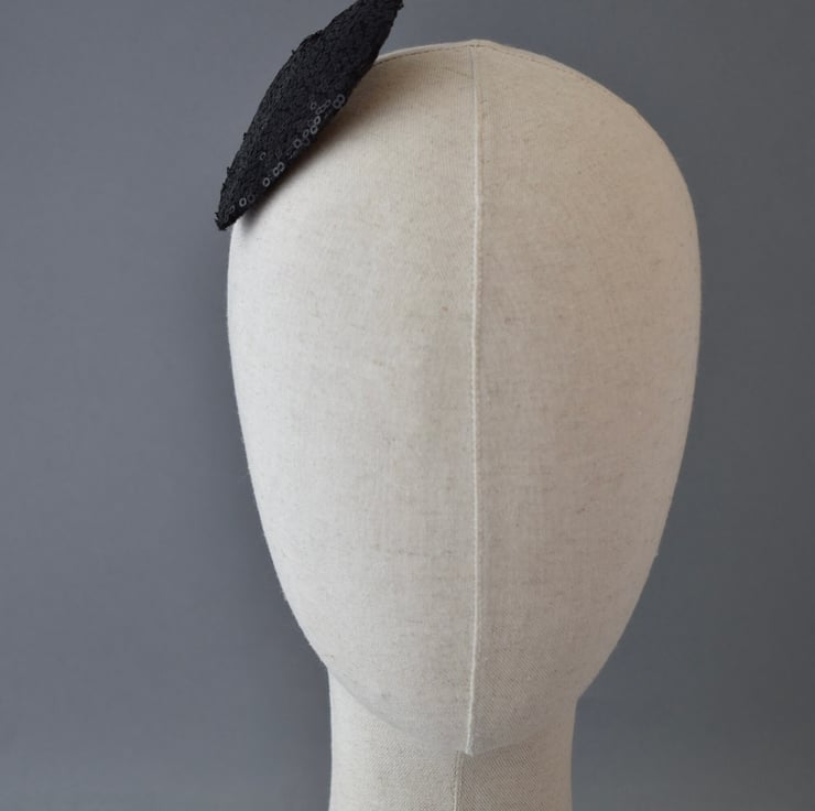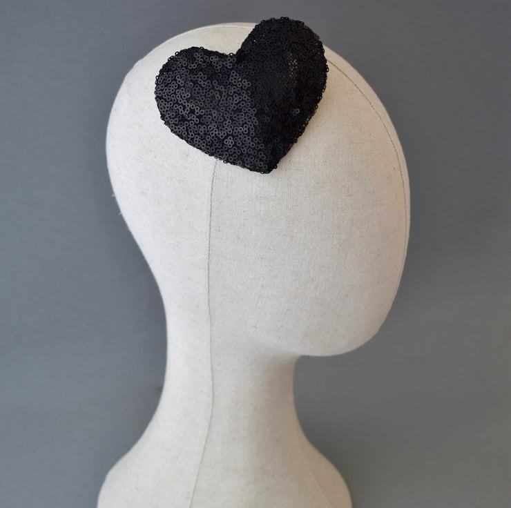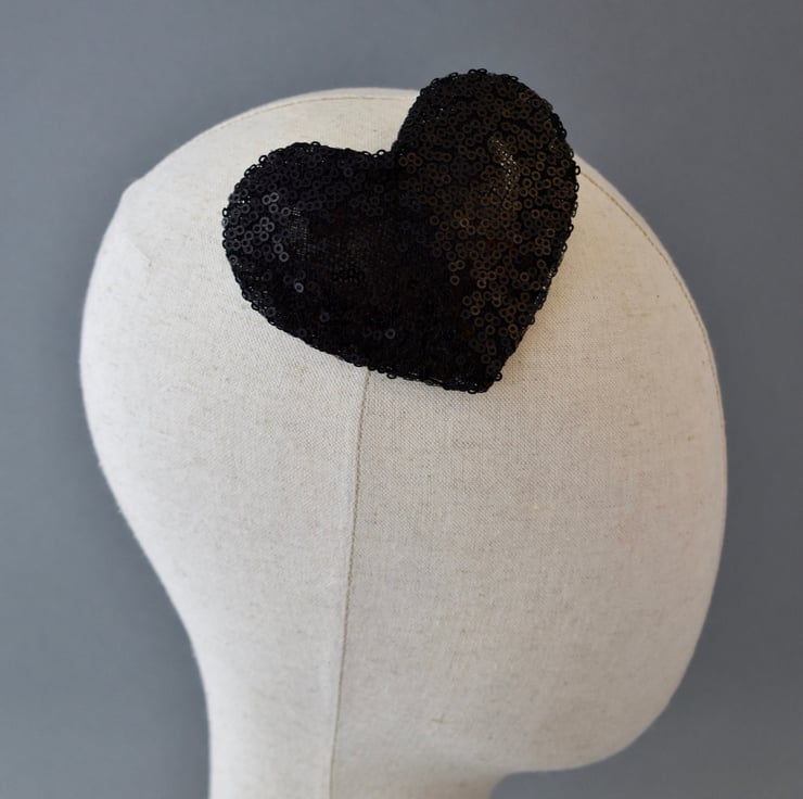 A handcrafted heart-shaped fascinator, covered in light catching black sequins.