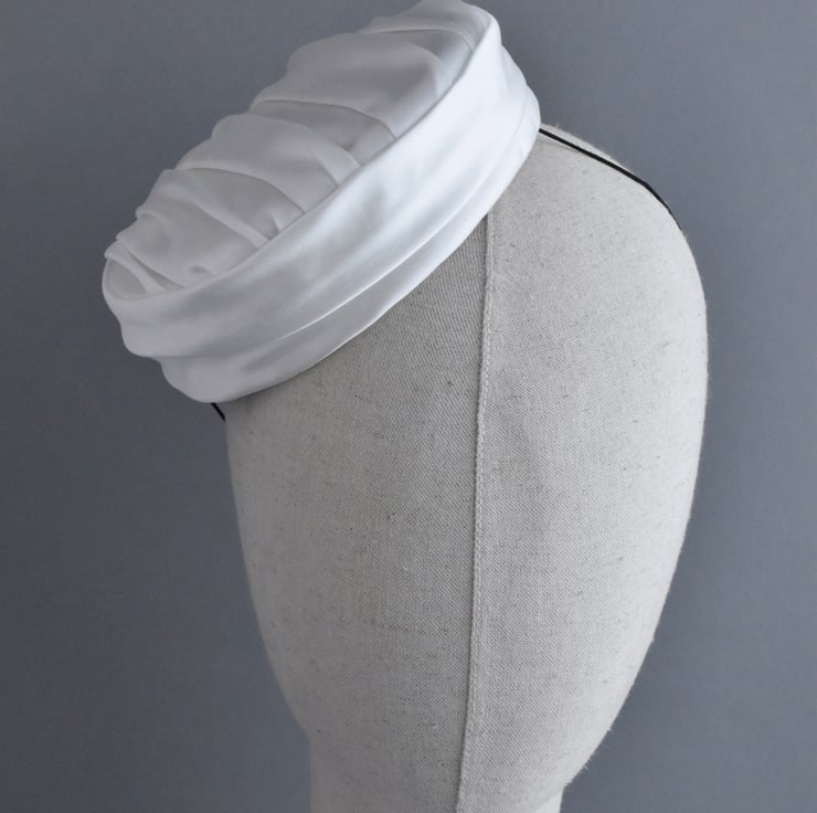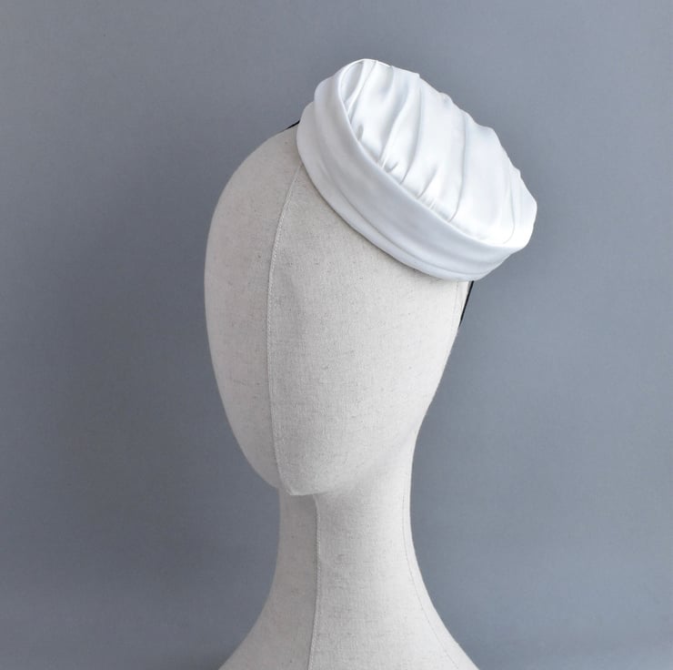 Inspired by drapery seen in vintage fashion, I handcrafted this ivory pillbox hat from ivory satin with a gorgeous sheen. A classic hat to add a touch of timeless 1950s style for your wedding, and one which can be worn again and again for many years following it.