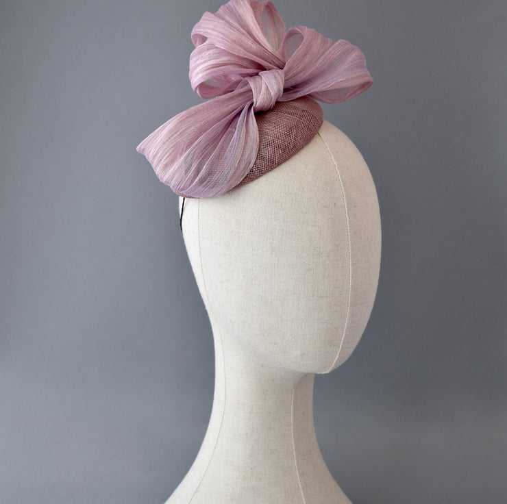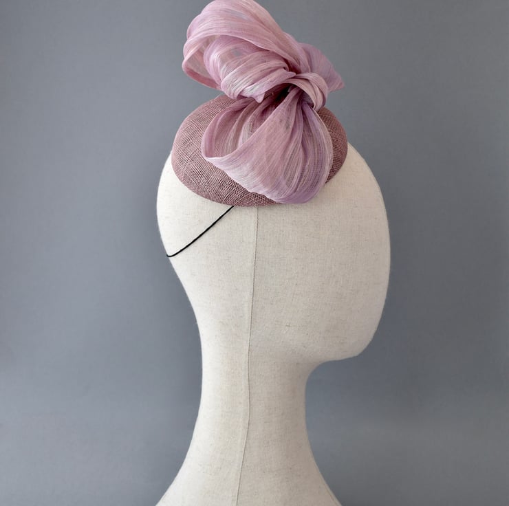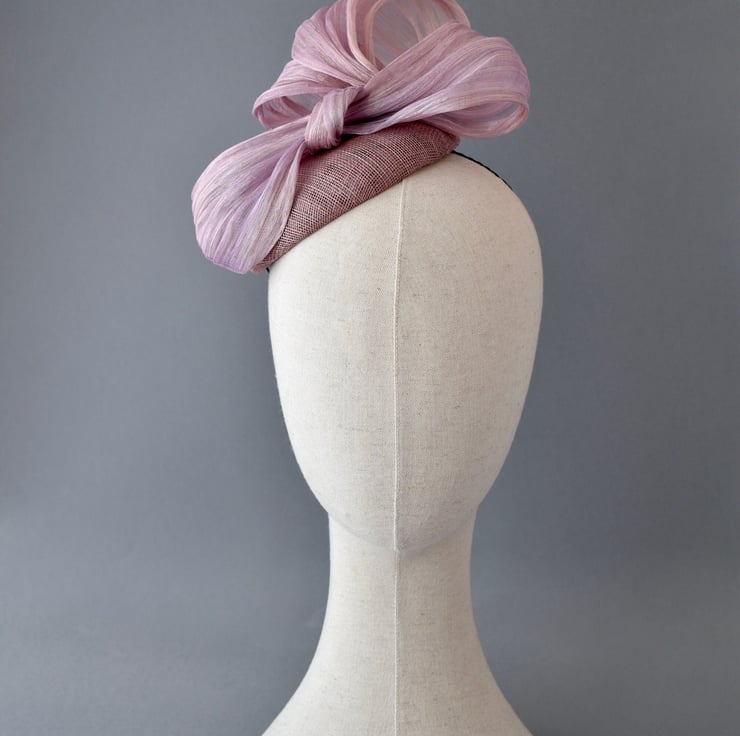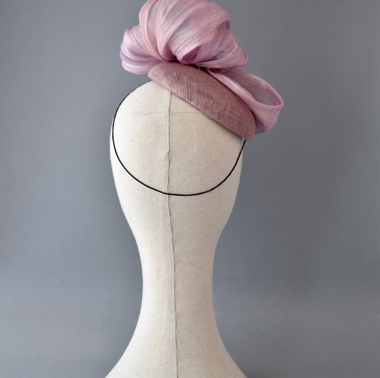A beautiful and modern percher-style hat, made from swirls of blush pink abaca which are hand-sewn upon a handmade sinamay base.