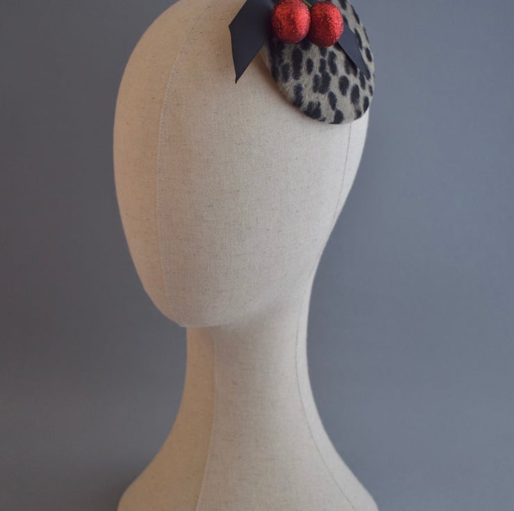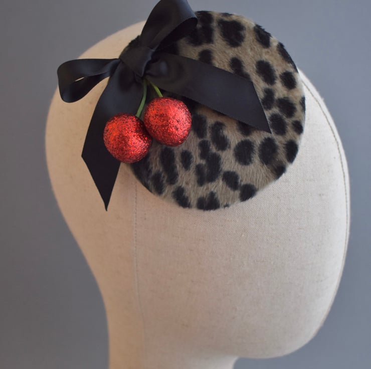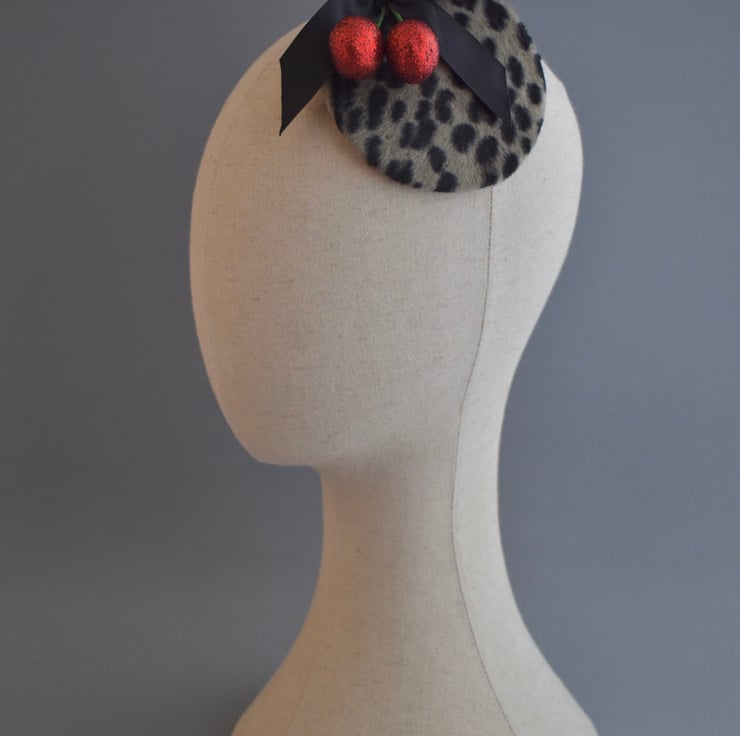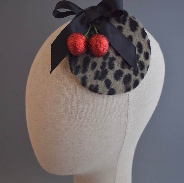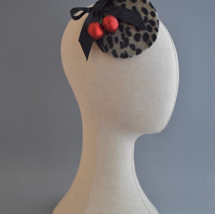 A glittery pair of red cherries and a black satin bow adorn this fun fascinator made using a wonderful soft faux fur in leopard print. The body of the hat has been fully handmade - with all shaping, wiring and sewing done by hand using traditional millinery methods in my Kent millinery studio.