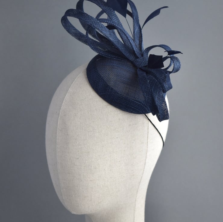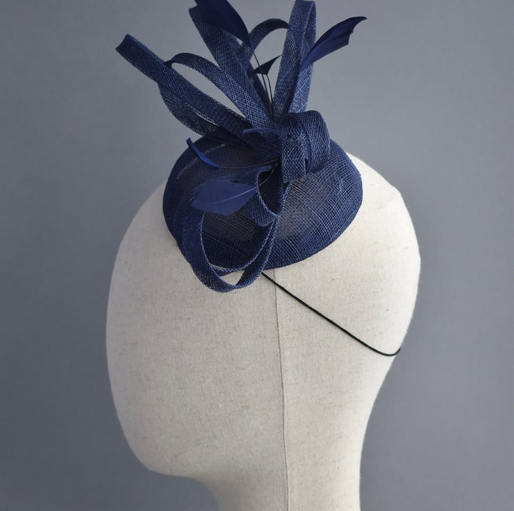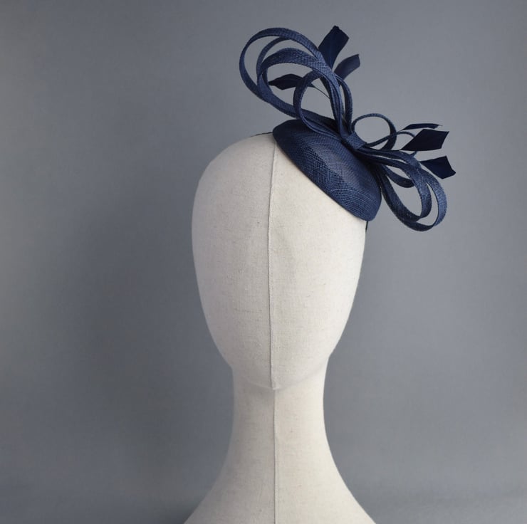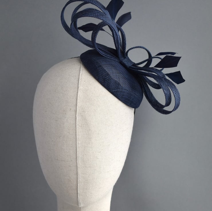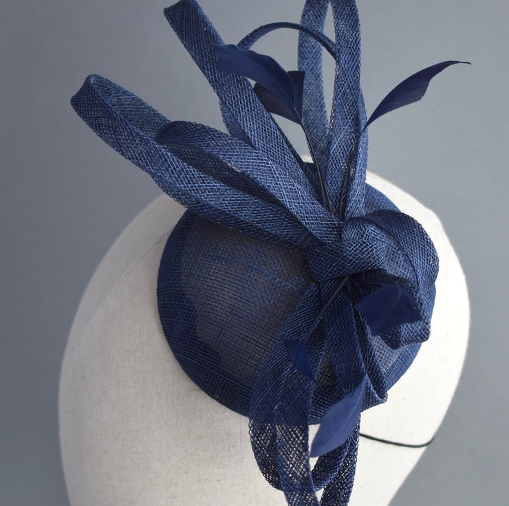 This lightweight percher hat has been handcrafted from classic navy blue sinamay, with loops of matching trim and feathers. This is the perfect easy to wear hat for wearing all day at a wedding, especially if you are a mother of the bride or groom after something more substantial than a fascinator, but don't want a large hat.