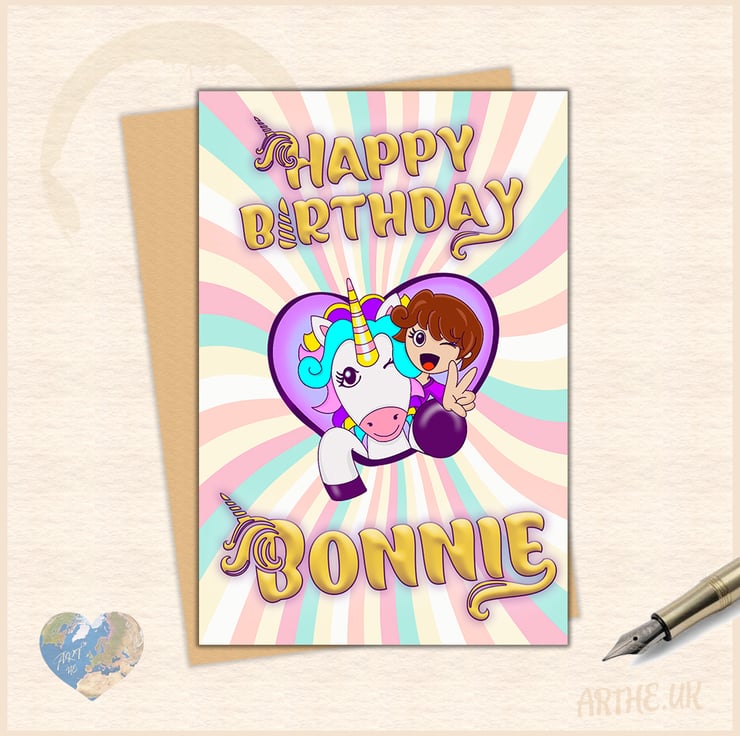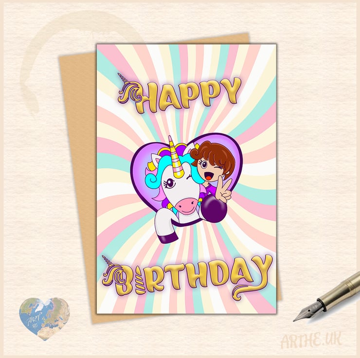 Have a Magical Birthday! A personalisable birthday card, featuring a quirky version of the cool birthday girl with her trusty unicorn sidekick.