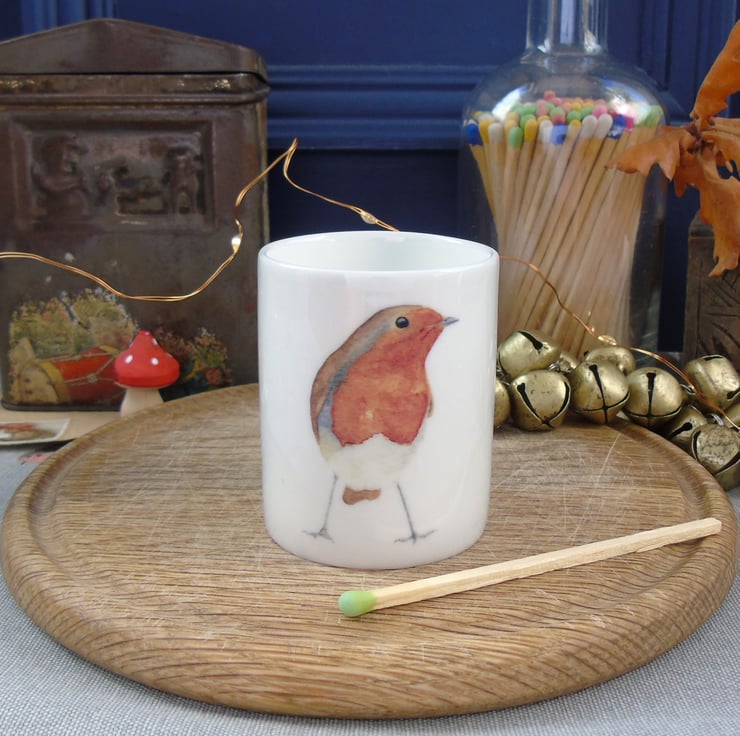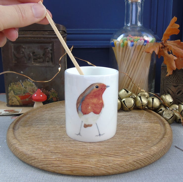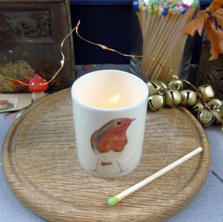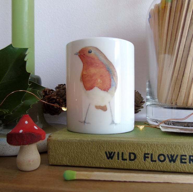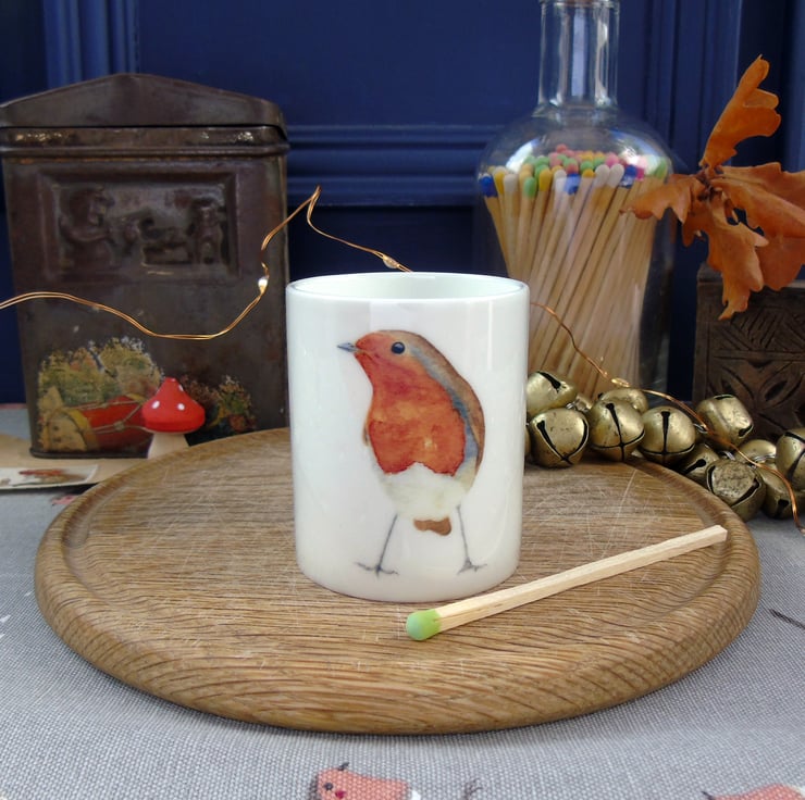 Bring some of the Christmas cosiness into your home with this delicate bone china candle holder featuring my cute robin illustration, a charming addition to your festive fireside.