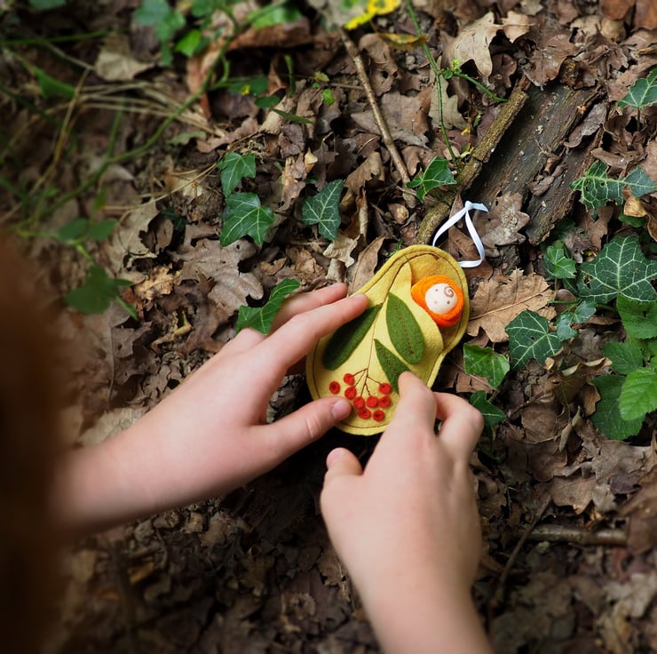 A teeny baby doll, a gift from the fairies, in a soft wool felt pod, decorated with rowan berries. The perfect gift for forest school, or anyone who loves being outside and a little bit of magic!