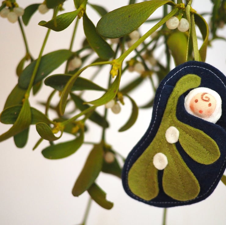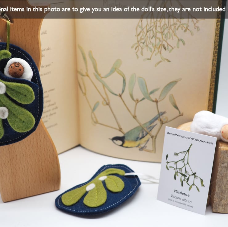 The tiny pixie doll is safely nestled inside a 100% wool felt, navy blue sleeping pod - the leaves and berries are appliqued on the front. She pops out and is made from soft cotton velour. Her head is a wool ball, covered in skin coloured cotton interlock and with carefully hand drawn details.