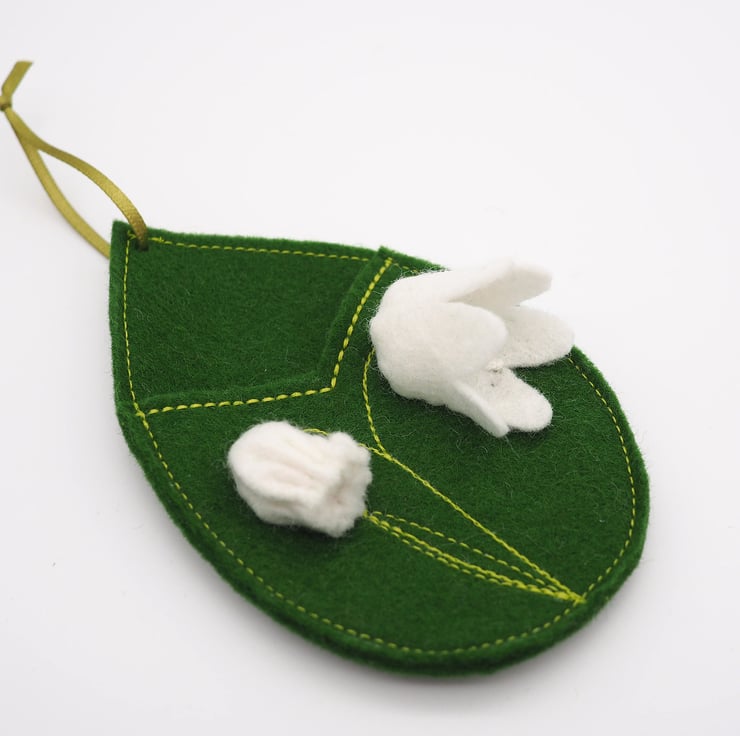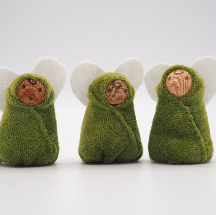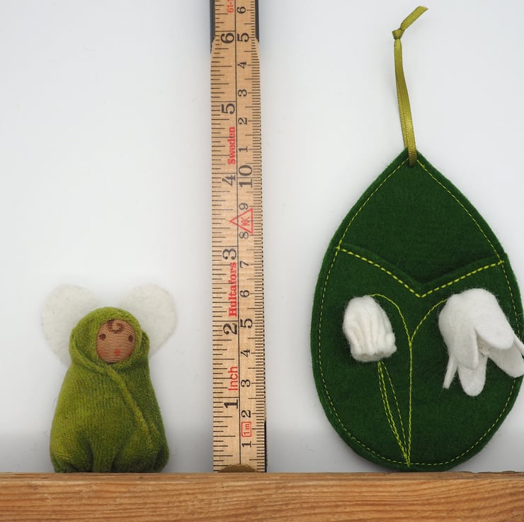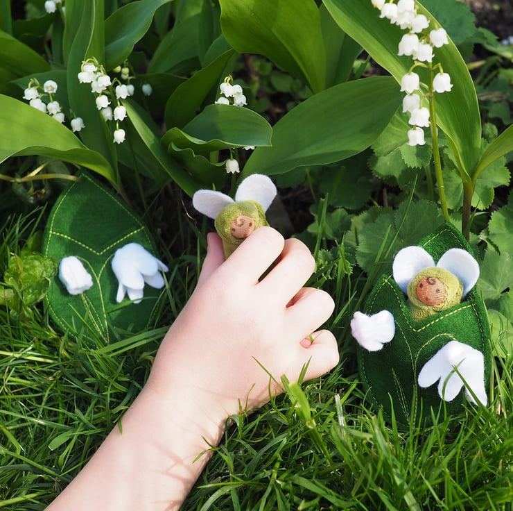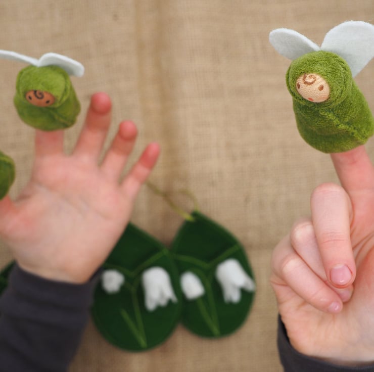 Lily is a flower fairy finger puppet with a moss green body and heart shaped wings. She sleeps in a leaf shaped green pod, with handmade lily-of-the-valley flowers stitched on the front and embroidered stems and leaf.