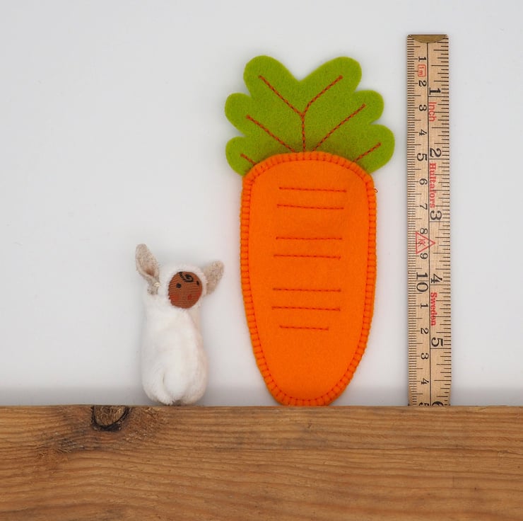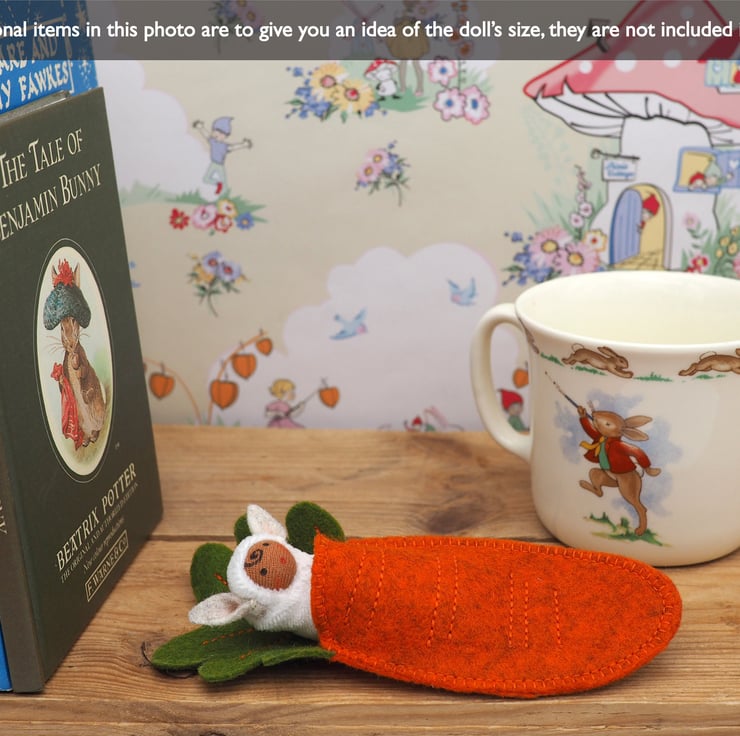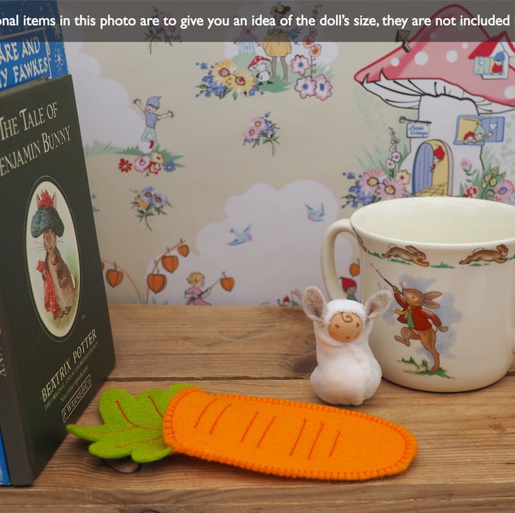 The wool felt carrot is 14 cm tall, and the doll is approximately 6 cm tall.