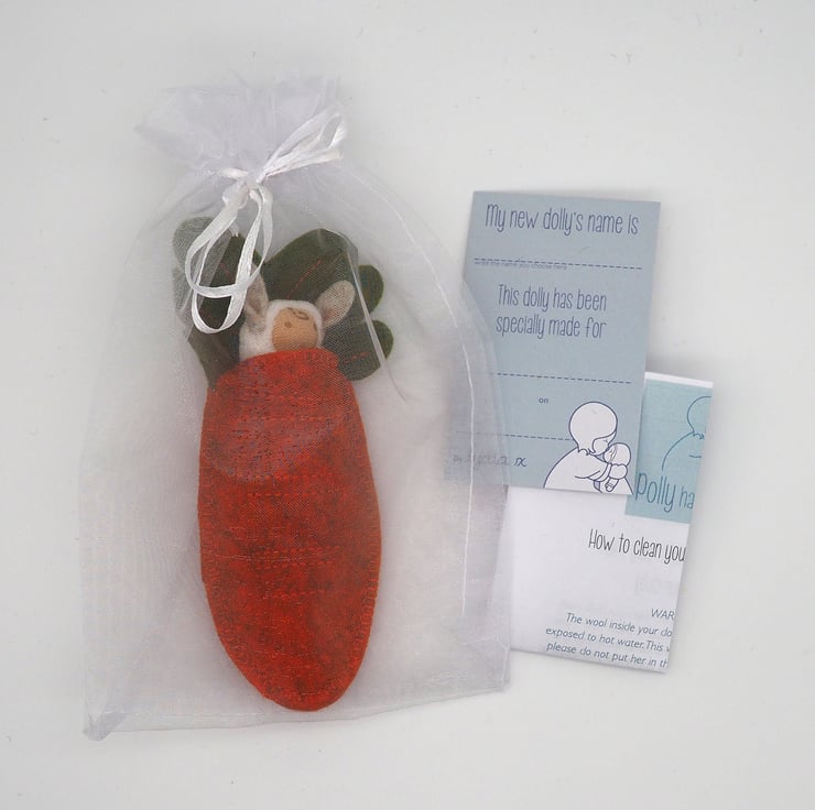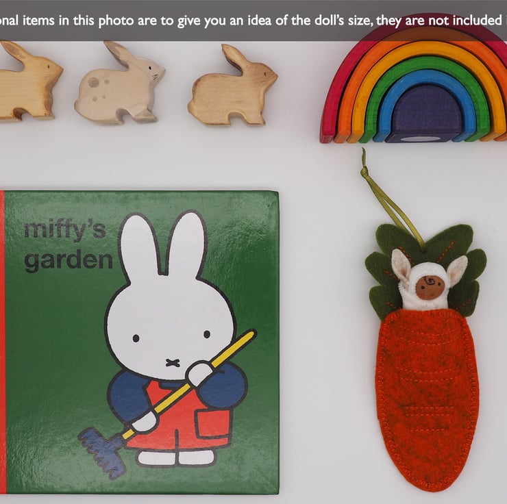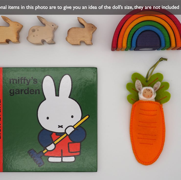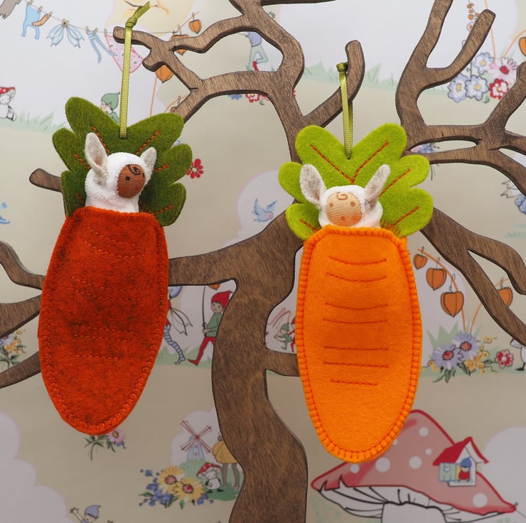 Each bunny sleeps in a carrot shaped pod with embroidery detail and a leaf 'pillow'. The carrot is made from pure wool felt which is soft and strong. The bunny is made from cotton velour and has pointy rabbit ears and a tiny tail.
