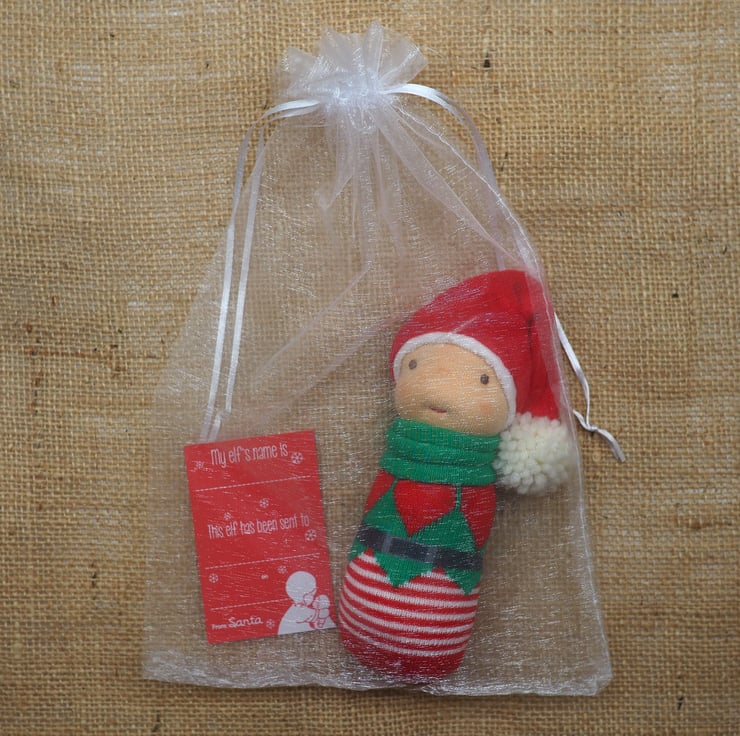 Your elf will come in an organza bag with an elf naming certificate from Santa and care instructions.