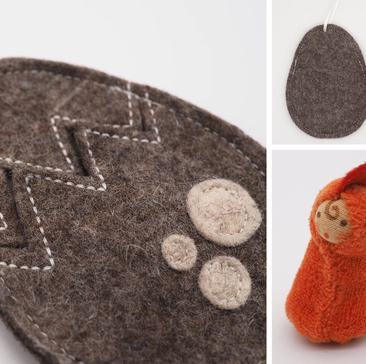 The wool felt egg is 11 cm tall, and the doll is approximately 6 cm tall. They are CE marked and safe fom birth. Play recommendation age 2 to 100 years!
