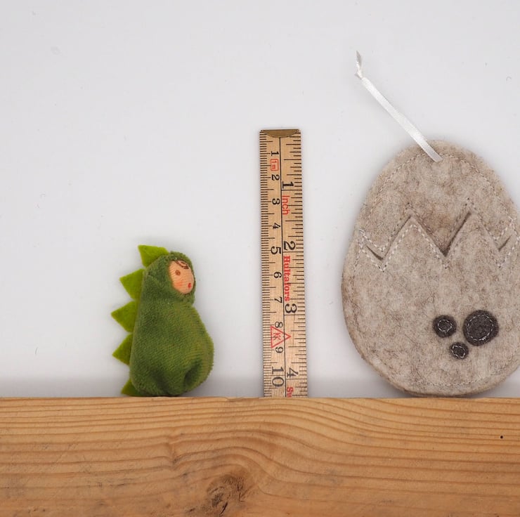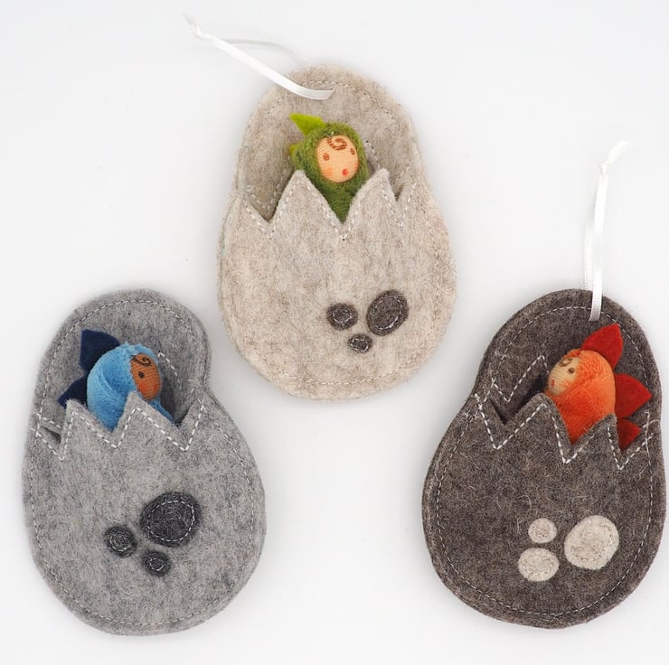Each dino sleeps in an egg shaped pod with appliqued spots and embroidery detail. The egg is made from pure, undyed sheepswool which is sorted before the felt is made to reveal the natural colour variations.