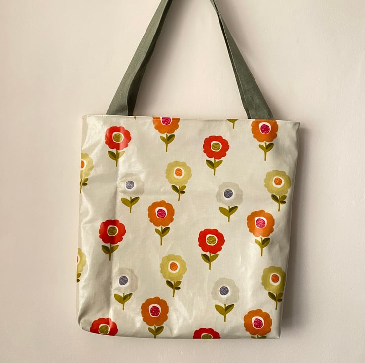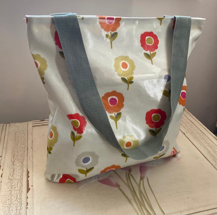 This beautiful tote bag in tutti fruiti design is waterproof and fully lined with 100% cotton. It has a box base to retain shape and a recessed zip to seal the tote shut. The handles are made from Sage green cotton herringbone tape webbing with a handle drop of 11 inches with a Sage green zip.