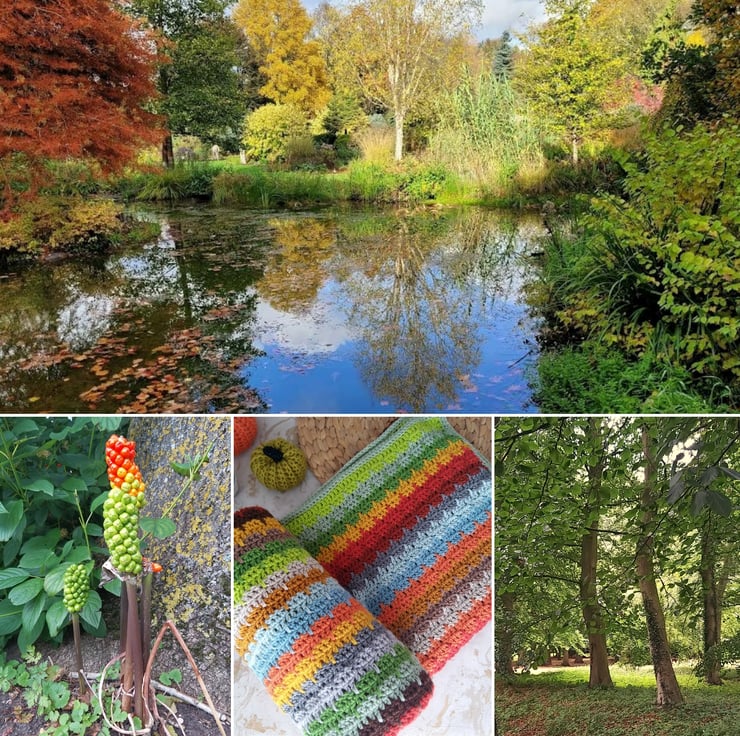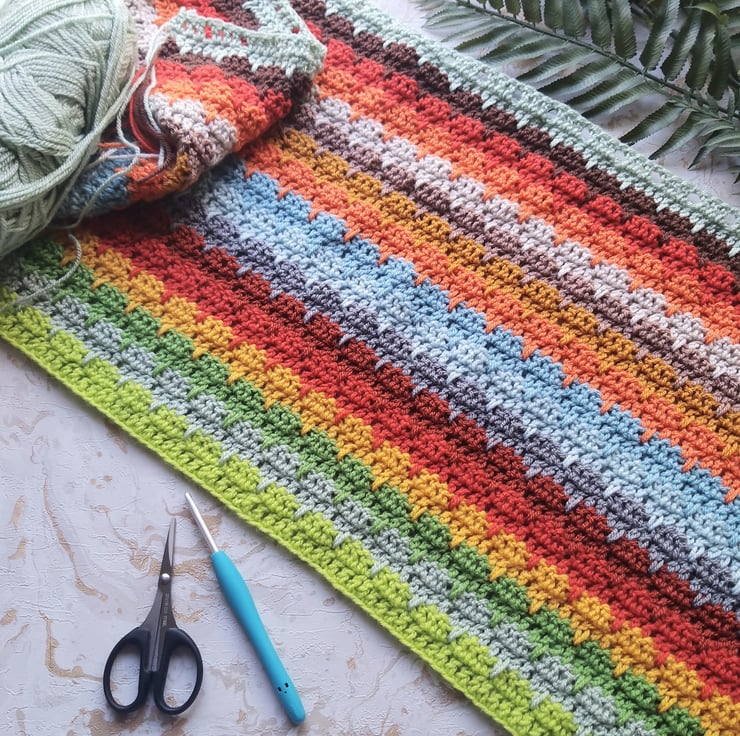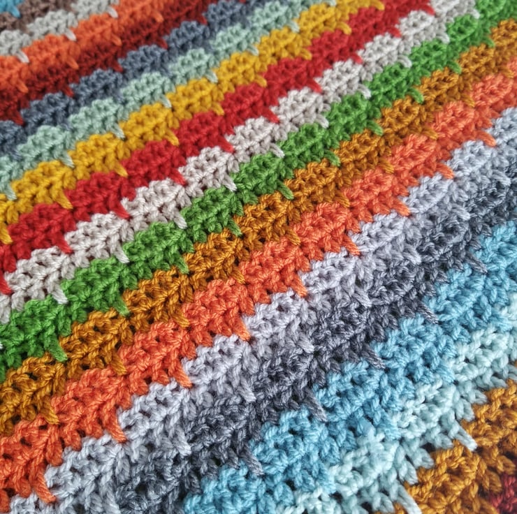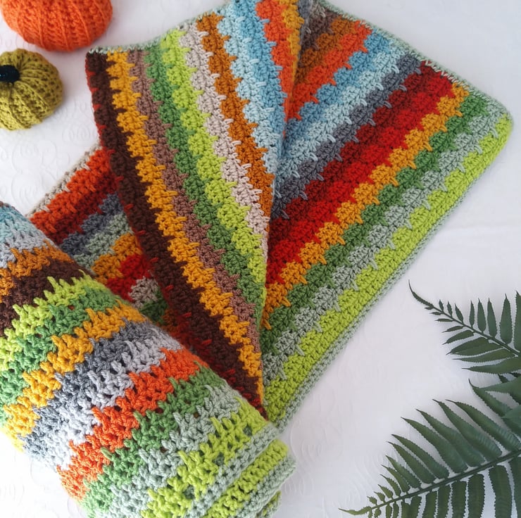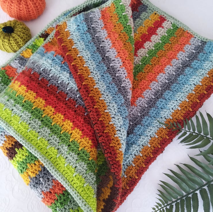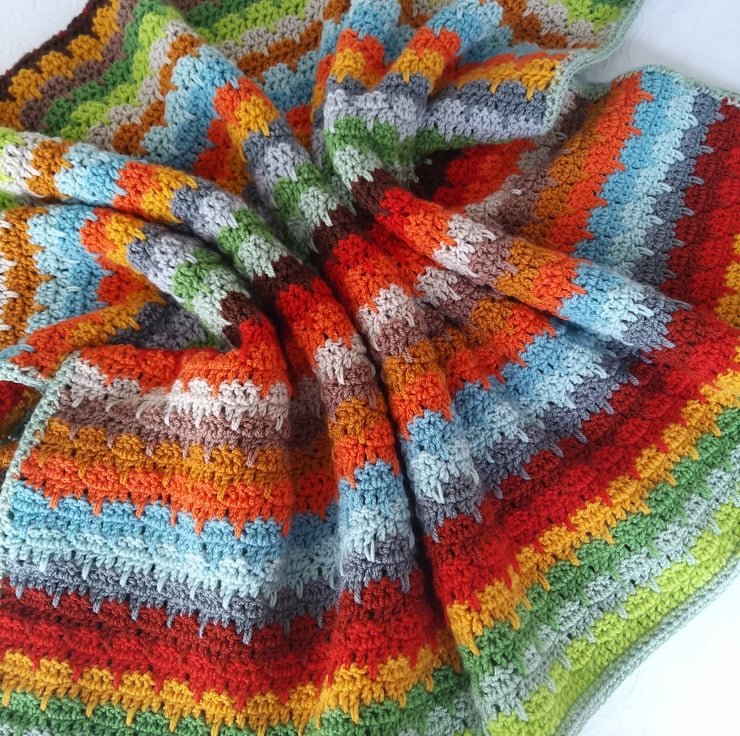 I took inspiration for the colour palette of this blanket from the beautiful woodland of Bressingham Gardens in Norfolk. Made in shades of Browns and Gold along with Greens and gentle Blues from the sky peeking through the tree tops or reflecting back from the pond in Foggy Bottom (an actual area of the gardens!). The stitch I’ve used leads you onto the next colour with it’s soft shape and I’ve used a simple border in a soft Sage to finish off.