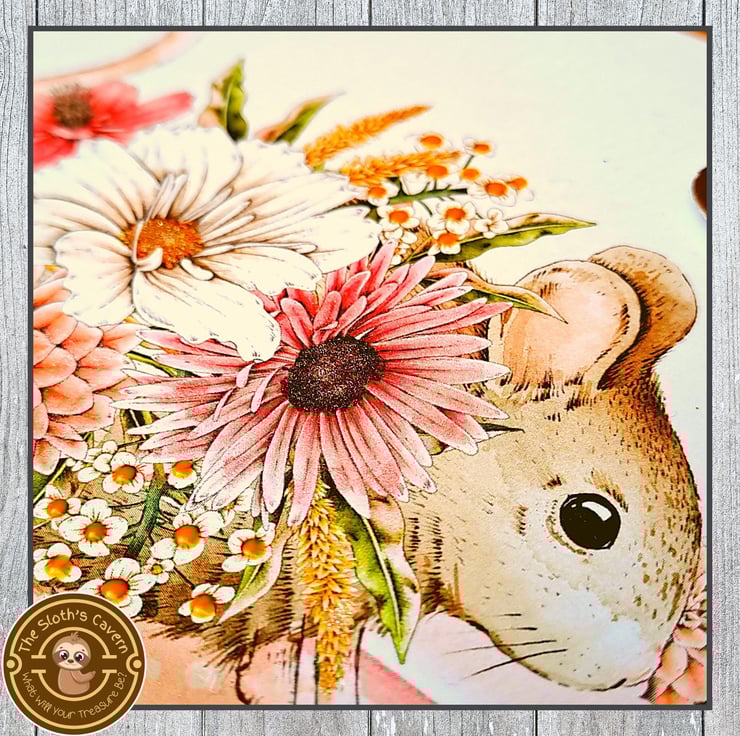 The card consists of gold pearlescent card layered with printed cardstock, displaying the image of a mouse in blooming flowers! It is decorated with a gold foiled topper with the sentiment "Congratulations", and a tag strip. Matching craft pearls decorate all four corners of the card. The flowers have got a layer of mica spray and glitter pen for an extra shine.