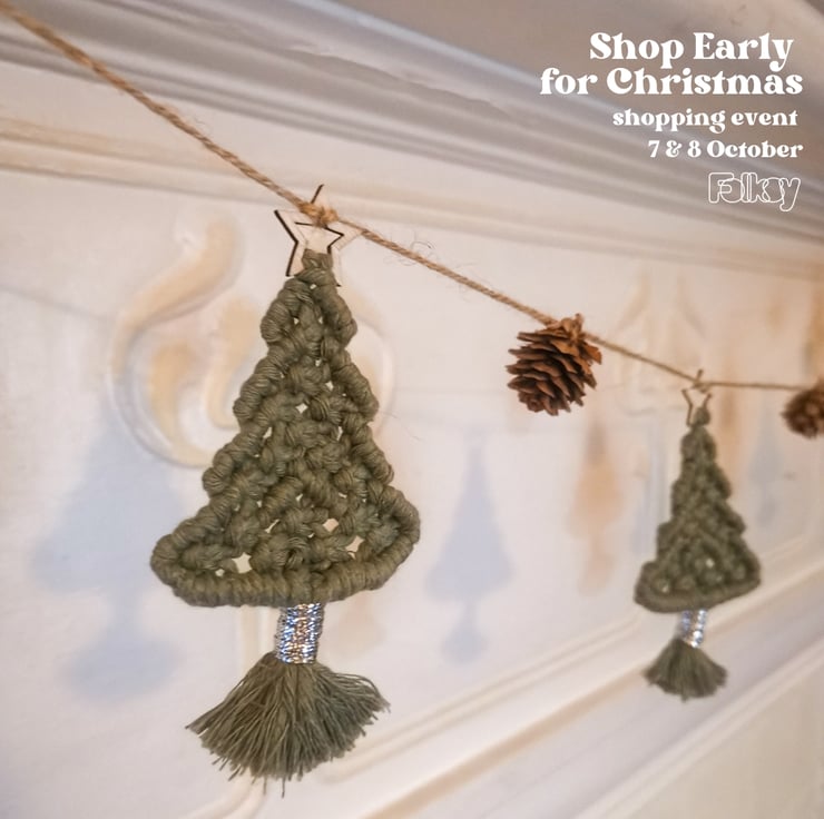 Brighten up your room with this festive decorative garland consisting of 6 macrame trees in moss green with silver wrap cord and small wooden stars. Added mini pine cones for that extra Christmas feel.