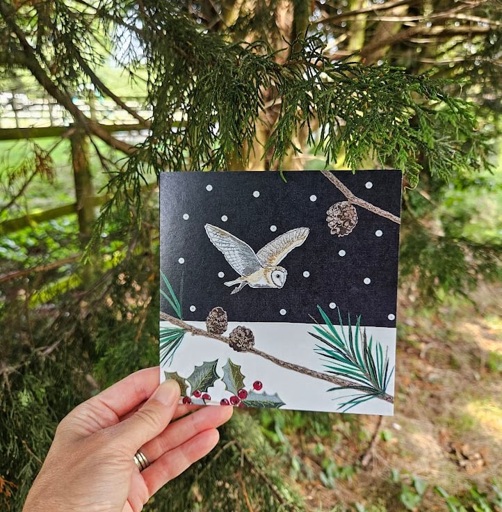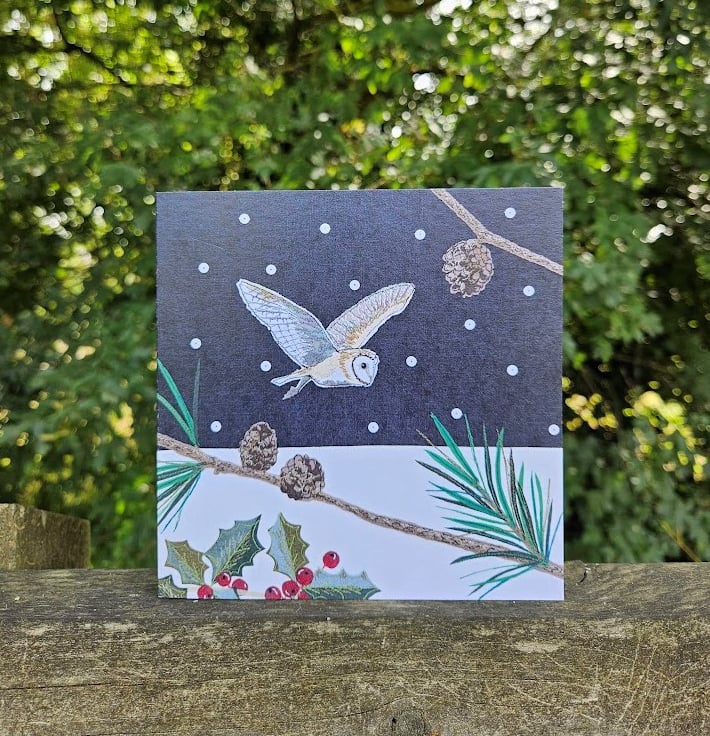 Barn owl in snowy scene, with holly berries, fir cones, pine needles - perfect for Christmas cards, as well as winter birthdays and thinking of you cards. Blank for your own lovely message.