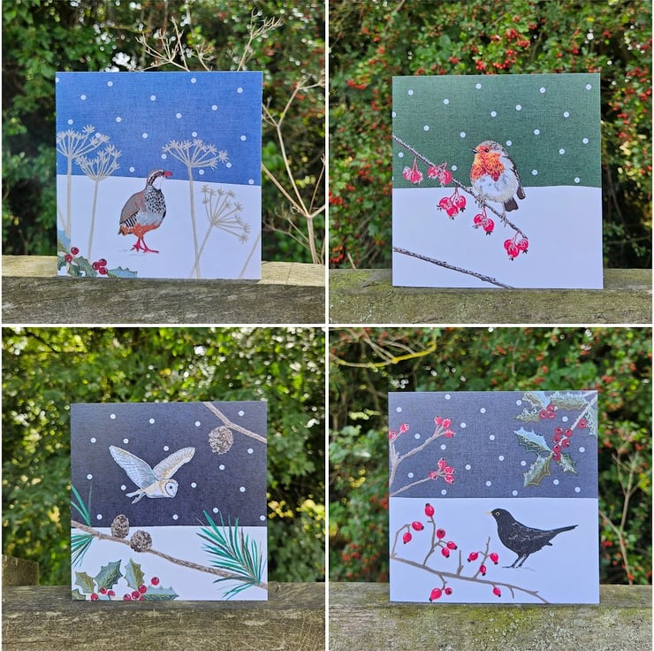 Also available as a set of 4 different designs - Blackbird, Robin, Barn owl and Red-legged partridge in wintry scene.
