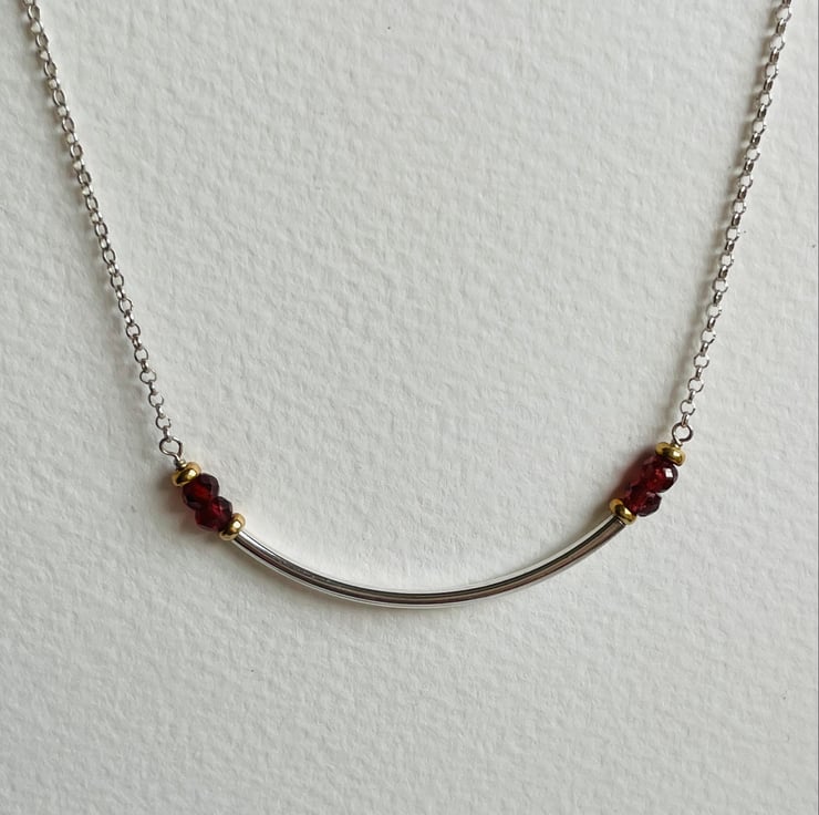 A sterling silver tube has been wire wrapped to a chain, along with very sparkly faceted garnet rondelles and gold filled beads.