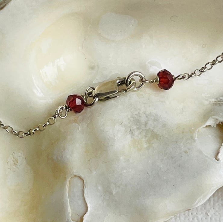 The total length of the necklace is 18” and it fastens with a sterling silver lobster clasp, accented either side by little garnets.