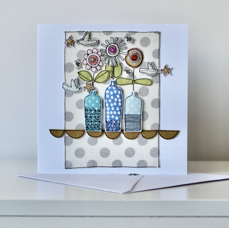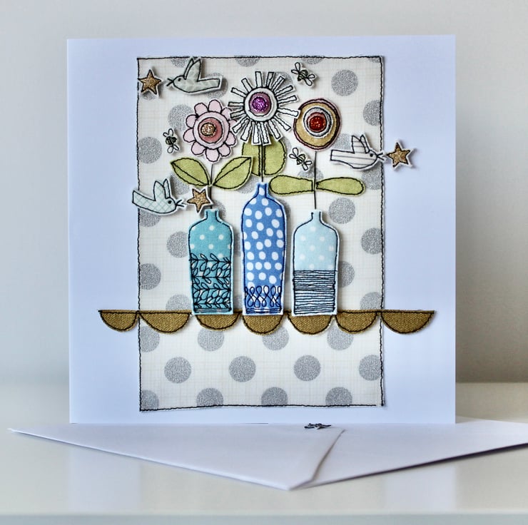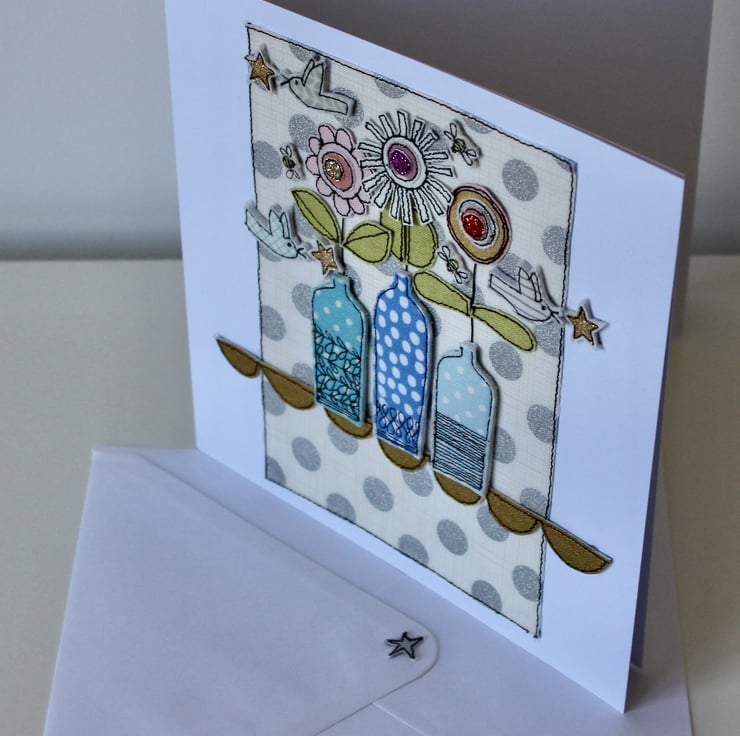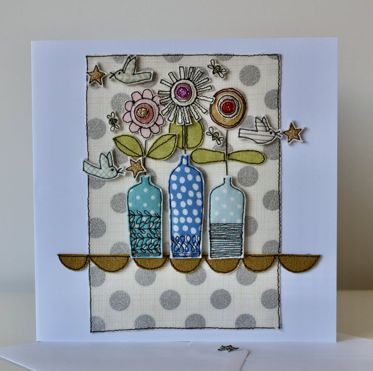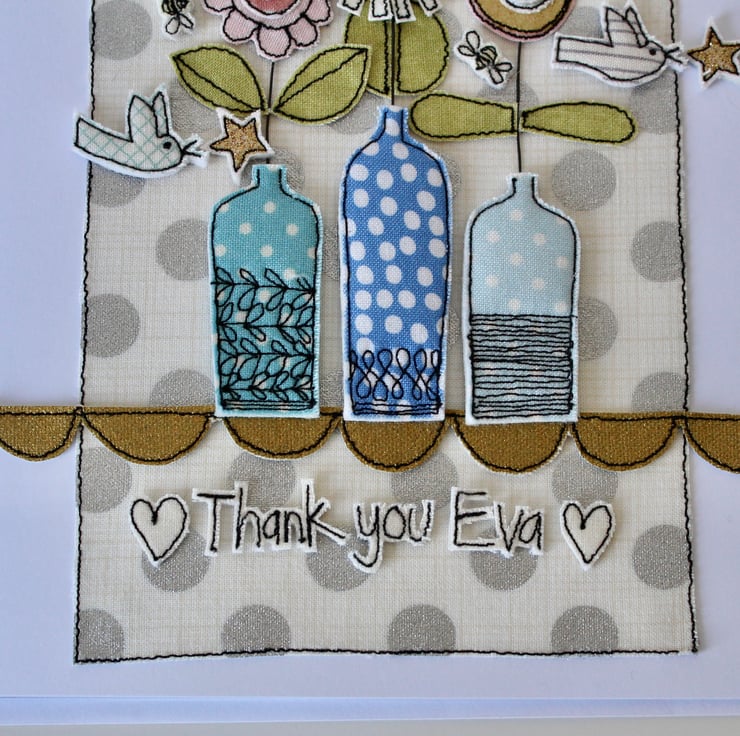 A handmade card which includes three vessels, three blooms, three birds, three bees and three stars. With the sewn words 'Thank you Eva'.