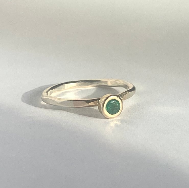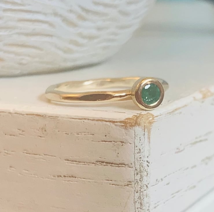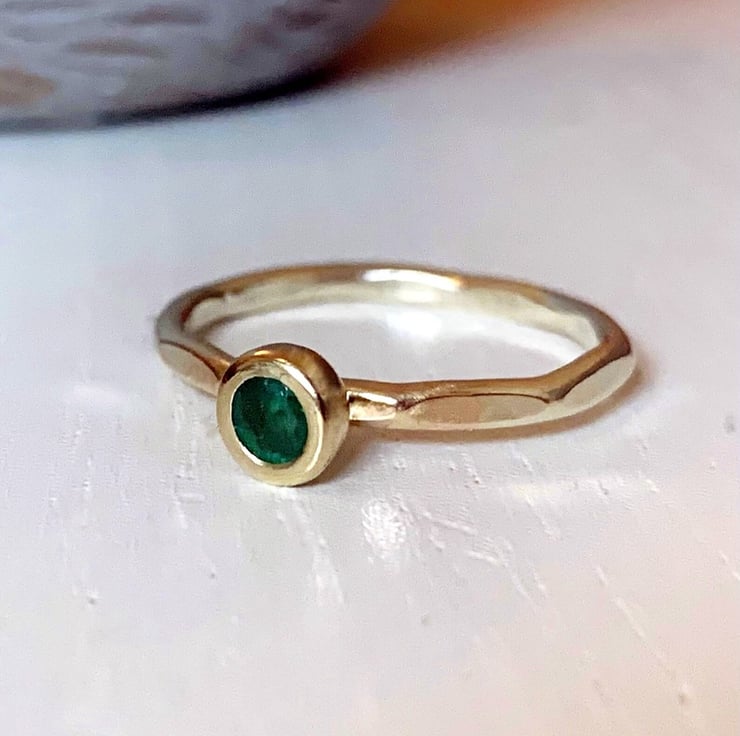 Made with recycled 9 carat gold, the setting bowl cup round setting. Set with a natural emerald, the emeralds I source are natural and slightly mis-shaped . My gemstone supplier a well know gemstone supplier in London, England. They have an ethical statement and are environmentally conscious gemstone supplier.
