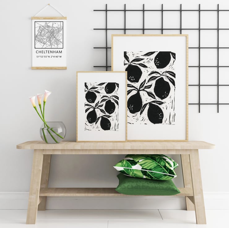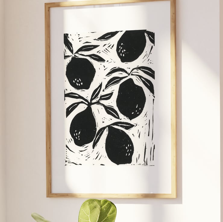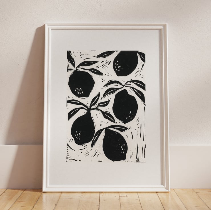 Lovely Dancing Lemons Black and White Minimalist Giclée Print taken from my original lino print.