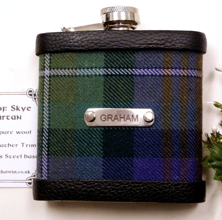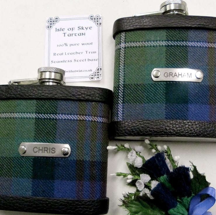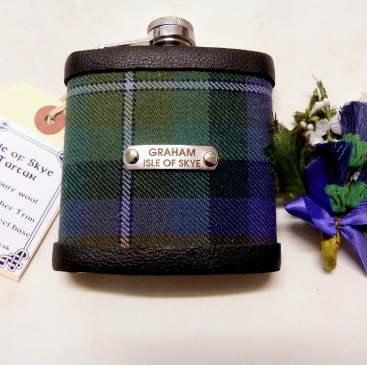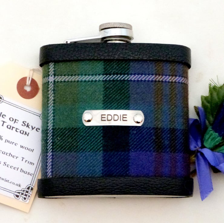 Customised Isle of Skye Tartan hip flask has tag with initials , name, date or motto of your choice riveted in position.
