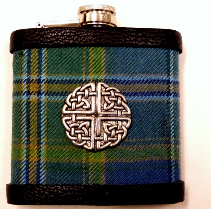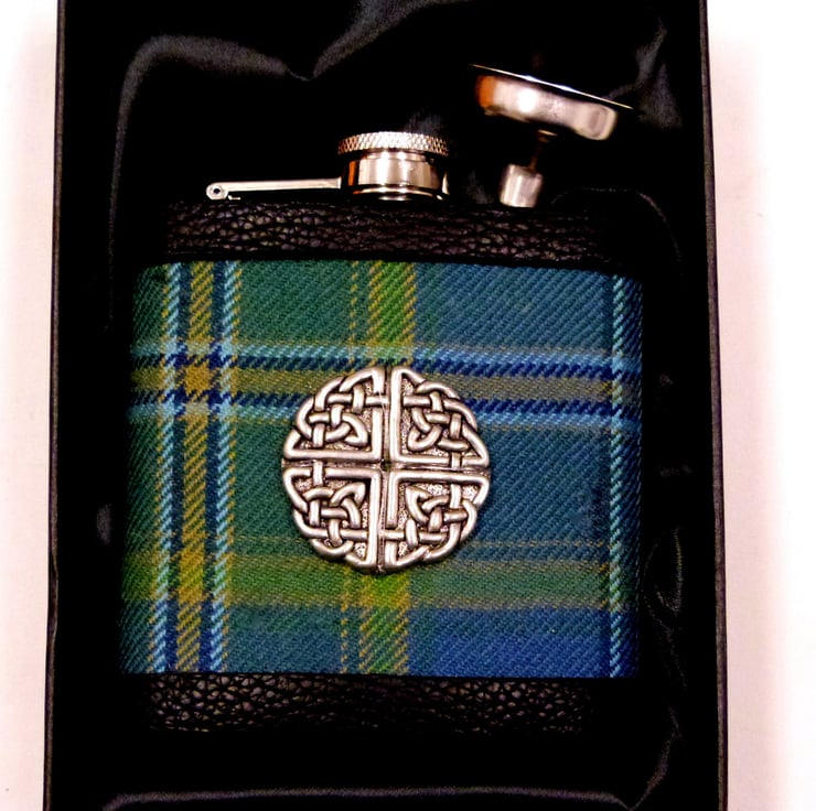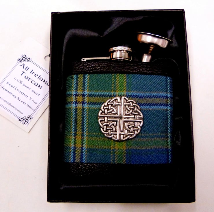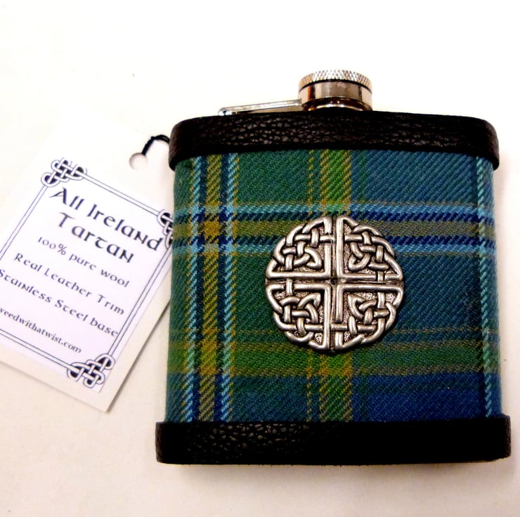 This hip flask is made with the pure wool All Ireland Tartan, and is set with a hand cast pewter Celtic knot. An ideal gift for Groomsmen, Best Man, Rather of the Bride or for Christmas, retirement , birthday present.
