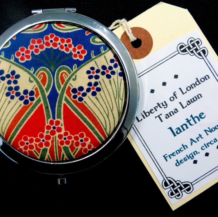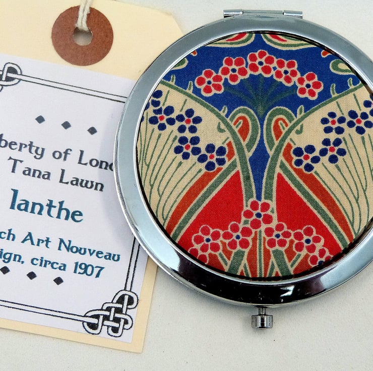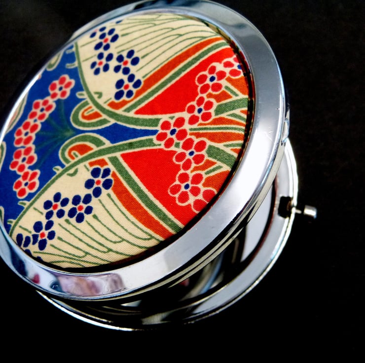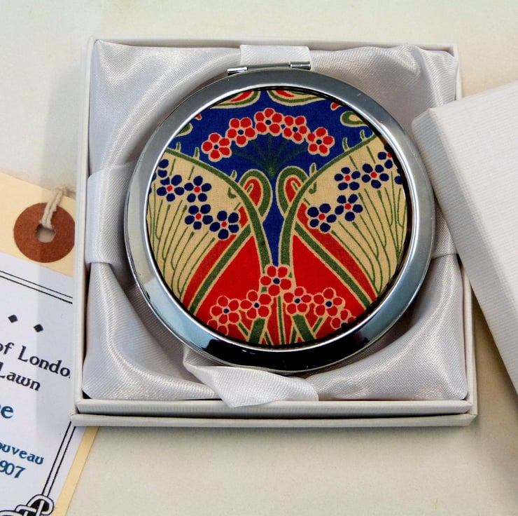 Compact Mirror in bright red, blue and cream Liberty of London Tana Lawn Ianthe fabric, making a lovely little gift for, Mother, sister, teacher or best friend. This elegant little mirror in the traditional art nouveau design is the ideal choice. It comes in a beautiful satin lined gift box as shown, or a quality velvet pouch, making an cute little present.