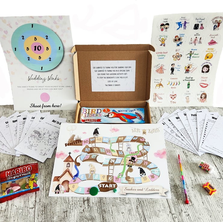Our wedding activity boxes include a reversible A4 Gameboard, wedding themed snakes & ladders & wedding themed tiddly winks on the other. 2 individual counters & a mini dice are provided to complete the set.