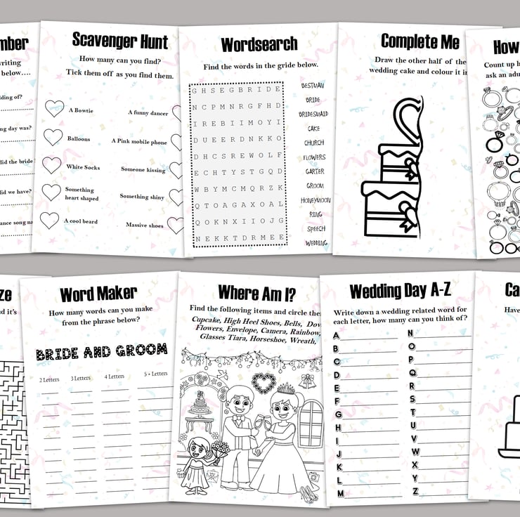 The front of each box can be personalized with the child's name, the names of the bride & groom, & the wedding date, adding a special & memorable touch to the activity pack.