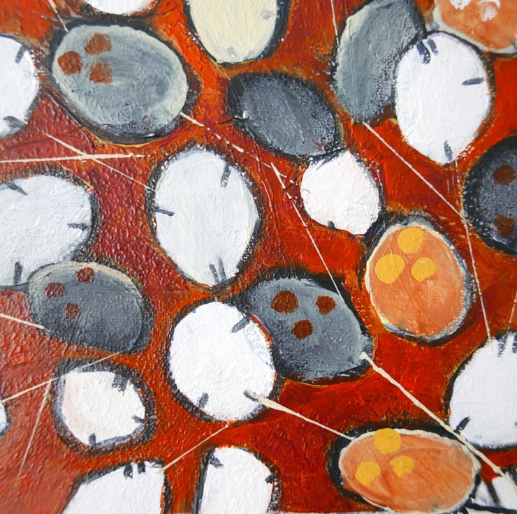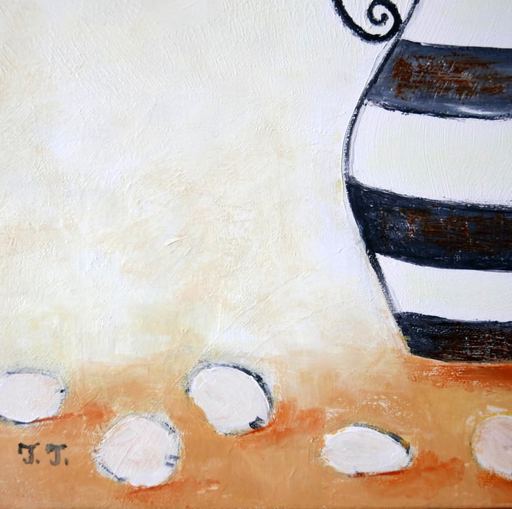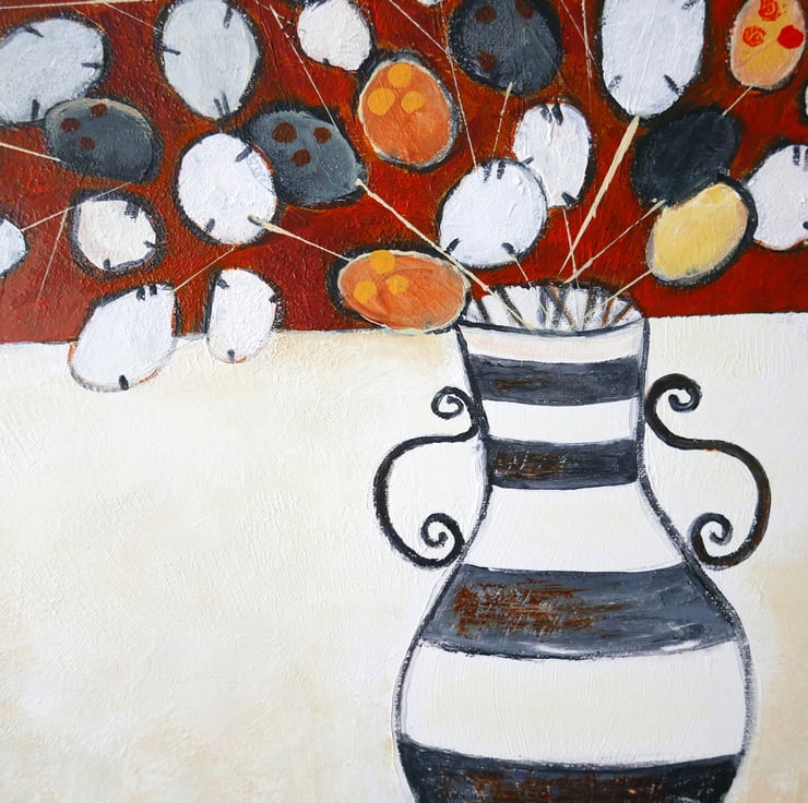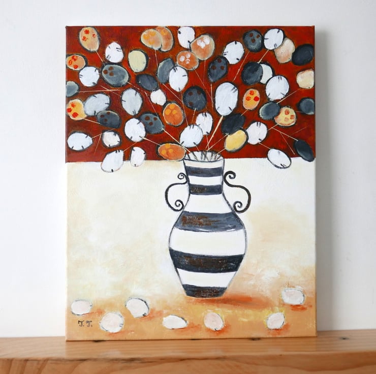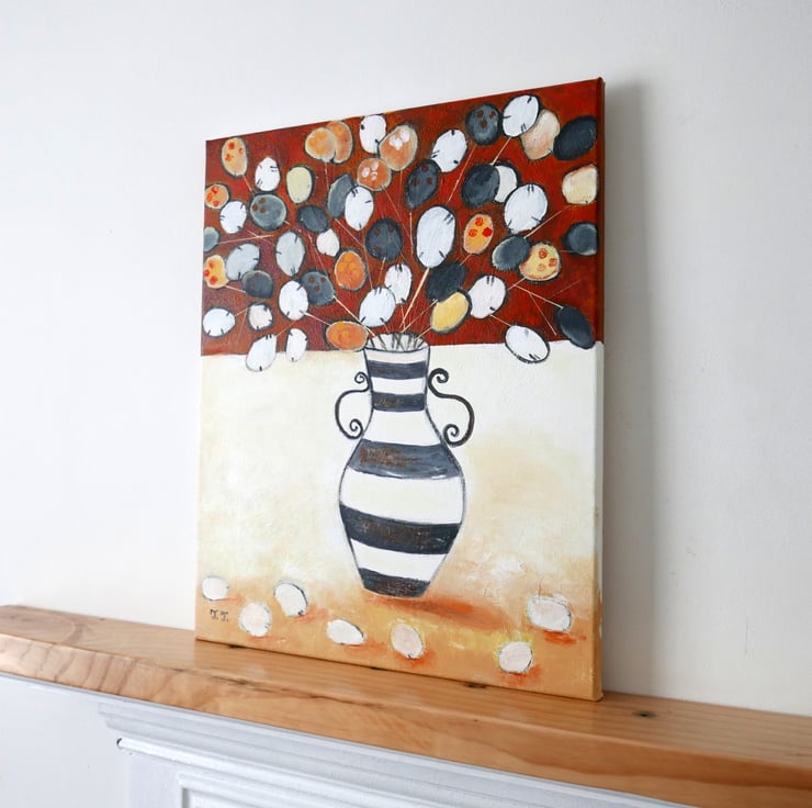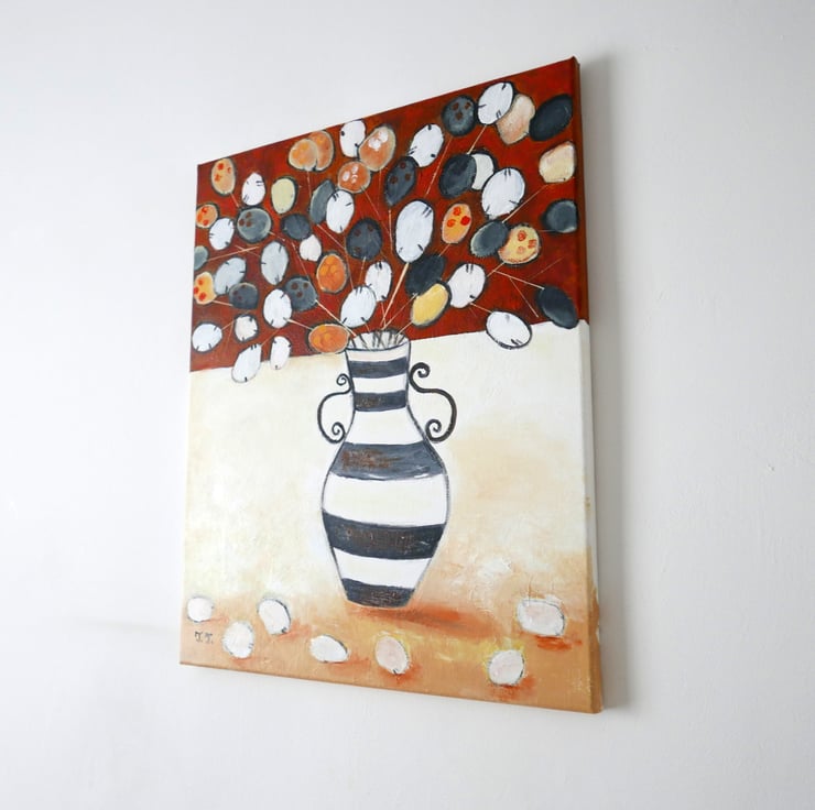 I created this artwork using acrylic on slim canvas and it features my interpretation of a bouquet of dried honesty flowers in shades of browns, cream, and yellows in a stripy black and white vase. The background is brown and cream and the vase makes a great contrast with the rest of the painting. The artwork has a contemporary look and you can place it on the wall on its own or in a group of two as well as part of a gallery wall. Please note that only one artwork is for sale, two photos show the artwork hung with other paintings as an example.